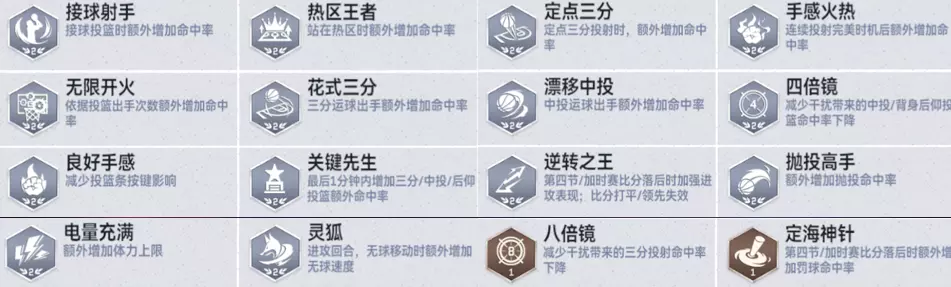 在徽章层面,他拥有【接球射手】、【热区王者】、【无限开火】、【花式三分】、【八倍镜】等一系列投射徽章,无论是接球就投还是运球干拔,都极具威胁。