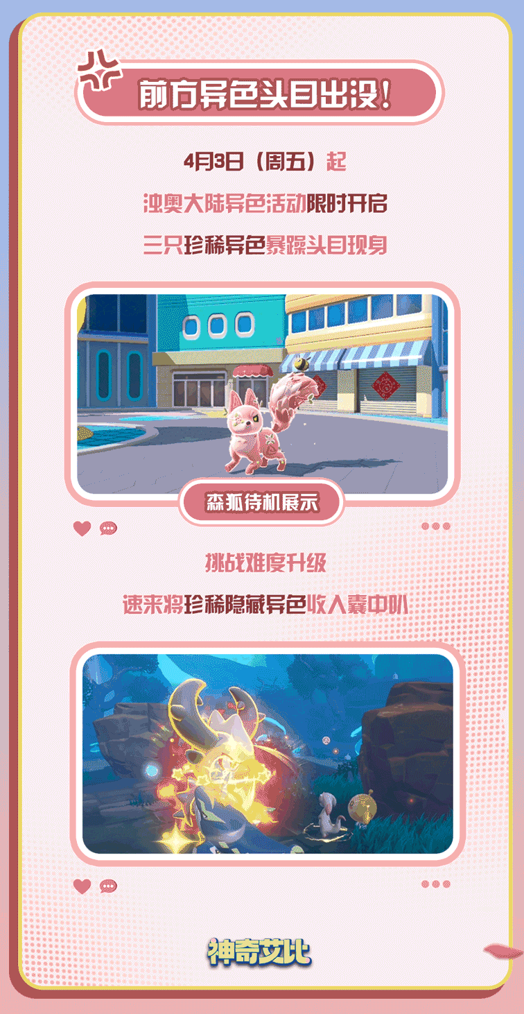 《神奇艾比》皮蛋节福利来袭,4月3日起,浊奥大陆将开启限时异色活动,三只珍稀异色暴躁头目现身;当天完成活跃任务还可免费领取至臻资质果、活力币,艾比丽芙卡也将在福利活动中返场。