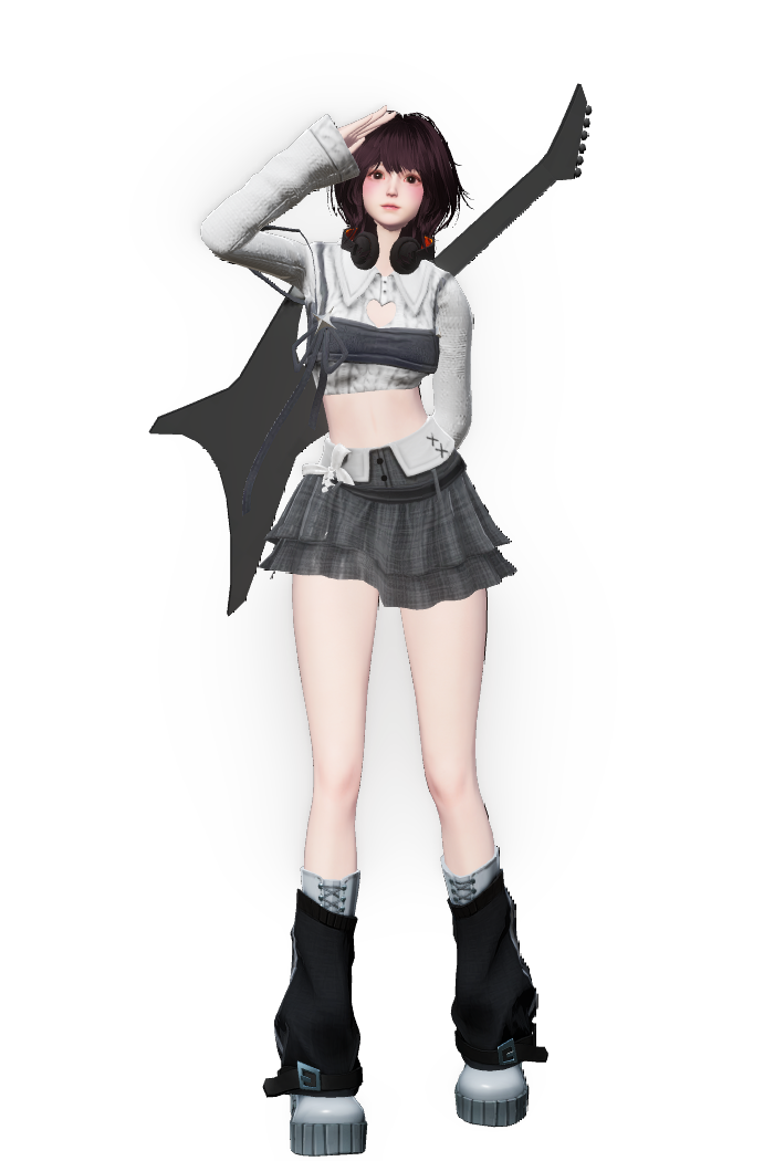 这是233的今日穿搭OOTD,展示了一位搭配露腰上衣、格纹短裙与个性靴装,还搭配吉他的潮流虚拟形象,尽显酷甜风格,是限时出街的亮眼穿搭。