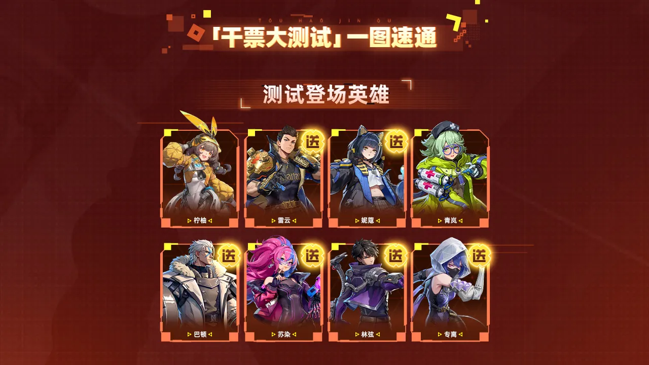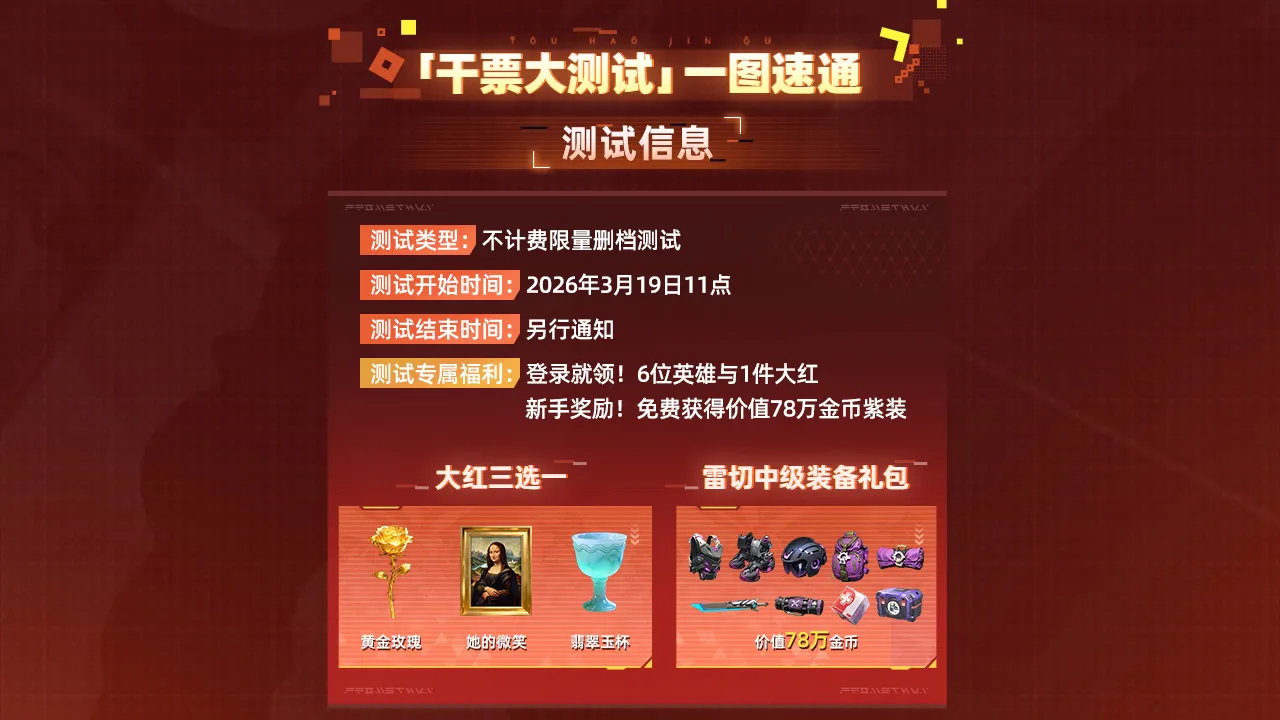 「干票大测试」为不计费限量删档测试,2026年3月19日11点开启,结束时间另行通知。登录领6位英雄等福利,测试含英雄混战玩法、多难度禁区、新地图山城、BOSS战、局外养成系统,还有多项贴心优化。