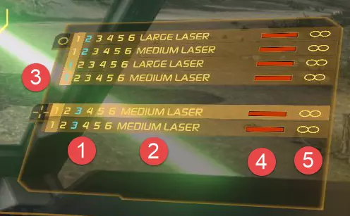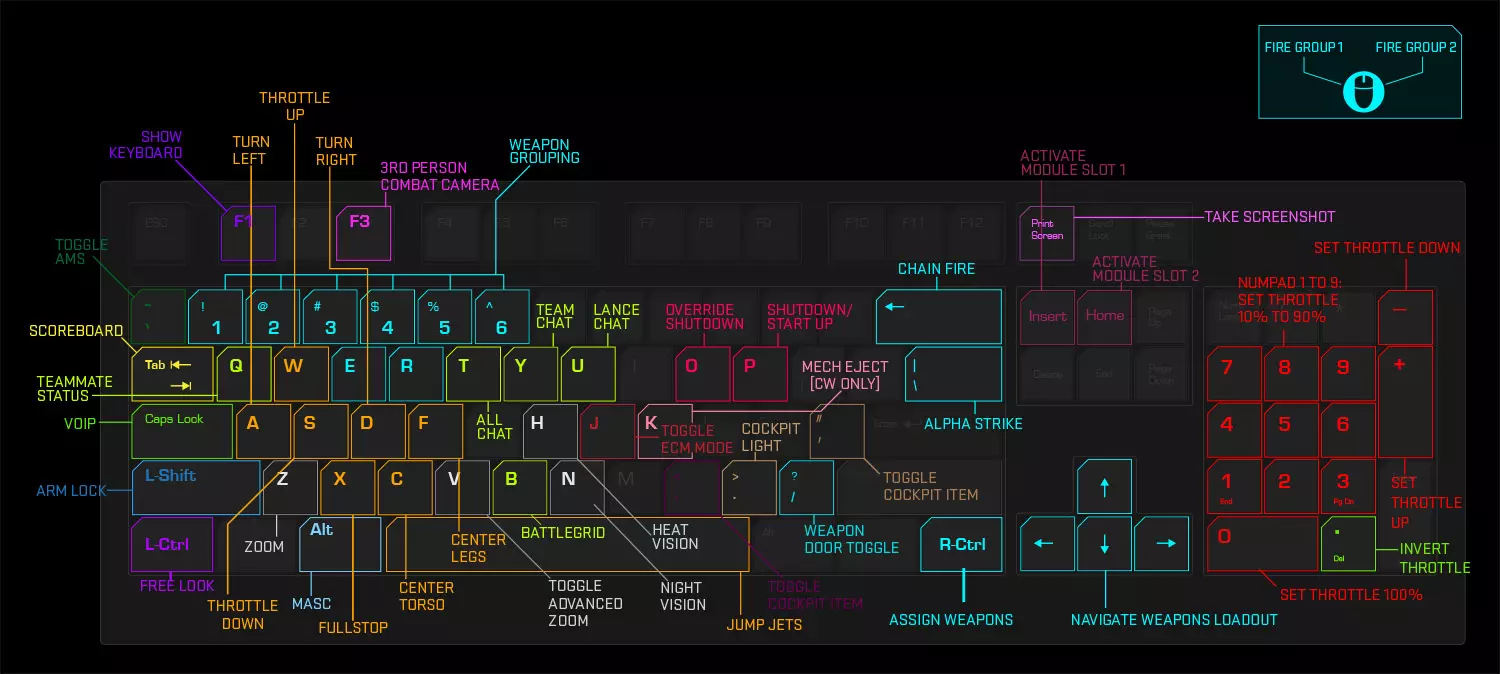 以下是游戏中各种指令的默认按键设置。这些按键均可在游戏内通过设置重新映射。W、A、S、D - 基础移动 R - 锁定机甲 空格键 - 激活跳跃喷射器 右Alt - 激活MASC(机械增强速度控制器) 右Shift - 解锁手臂 右Ctrl - 驾驶舱环顾 Tab - 查看团队计分板 Q - 查看传感器详情 T、Y、U - 分别与全体、团队或 lance 队友聊天 H - 激活热成像 N - 激活夜视仪 方向键、左Ctrl、退格键 - 选择并修改武器组 反斜杠 - 阿尔法打击 数字键 - 发射对应武器组 小键盘 - 设置油门 F3 - 切换第三人称视角 P - 开机/关机 O - 覆盖过热关机 Z - 切换缩放等级 V - 切换高级缩放 C - 上身与腿部对齐 F - 腿部与上身对齐 Home、Insert - 使用消耗品 J - 切换ECM模式 武器组与HUD界面 学习在游戏内外对武器进行分组,因为武器组是任何机甲作战的核心。机甲战士的生存之道。记住,所有武器都会产生热量。除此之外,PGI还引入了【幽灵热量】机制,以防止玩家堆叠过多同类型武器并同时开火。热量的核心问题在于,如果你开火次数过多,机甲就会 shutdown。相信我,这绝对是件糟糕的事,因为它总是在你生死搏斗的关键时刻发生。