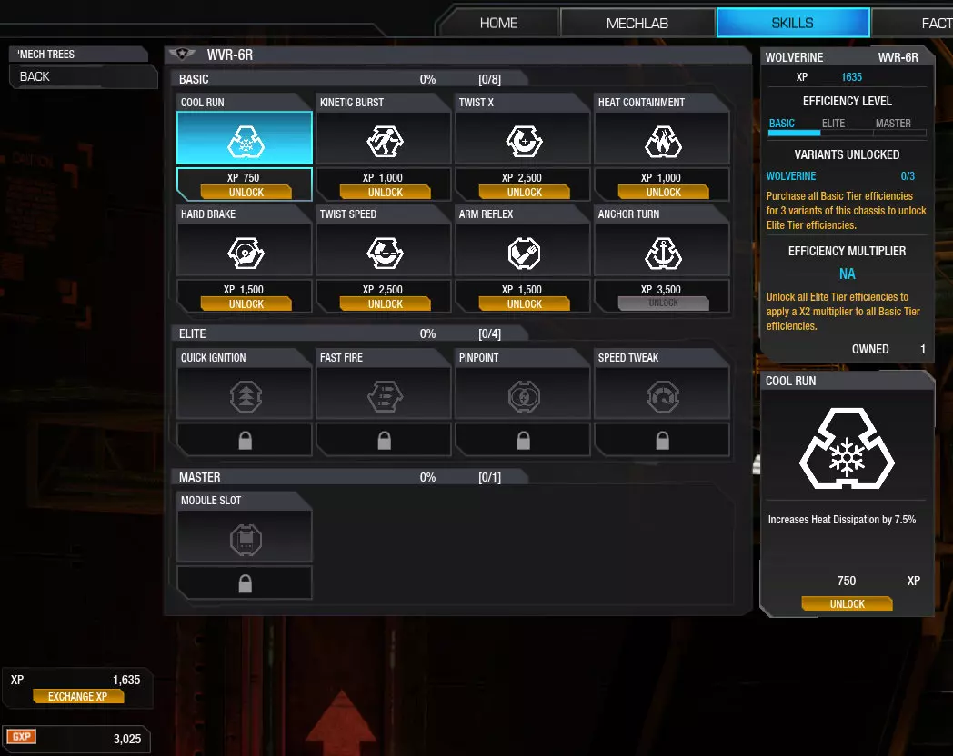 技能 每场游戏获得的三个物品中有两个是机甲经验值和通用经验值(第三个是星际币)。机甲经验值可用于机甲技能树,以提升机甲各方面的性能。这些技能是特定变体专用的,会影响诸如冷却时间缩短(记住武器会产生热量)、速度提升和转向速度加快(这与“坦克模拟”类玩法相似)等方面。 通用经验值可用于飞行员技能树,以解锁各种“模块”,这些模块能为你提供诸如武器射程小幅增加或火炮打击等效果。我们稍后会详细讨论模块,但可将其视为一项高级功能。你需要用通用经验值解锁模块,然后用星际币购买该装备,以便在自定义机甲时装配,这与武器的装配方式非常相似。目前,要完全提升单个指定机甲类型(例如风暴鸦、阿特拉斯、潜行者)的机甲技能(可理解为效能),你需要3个机甲底盘变体。确保将机甲系列中每个变体的技能提升至大师级,这会显著增强机甲的性能。 由于大师级技能需要3个变体的规则,初始机库最好不要只配备1台轻型、1台中型和1台重型机甲,而是选择同一机甲的3个变体,这样才能达成大师级技能。