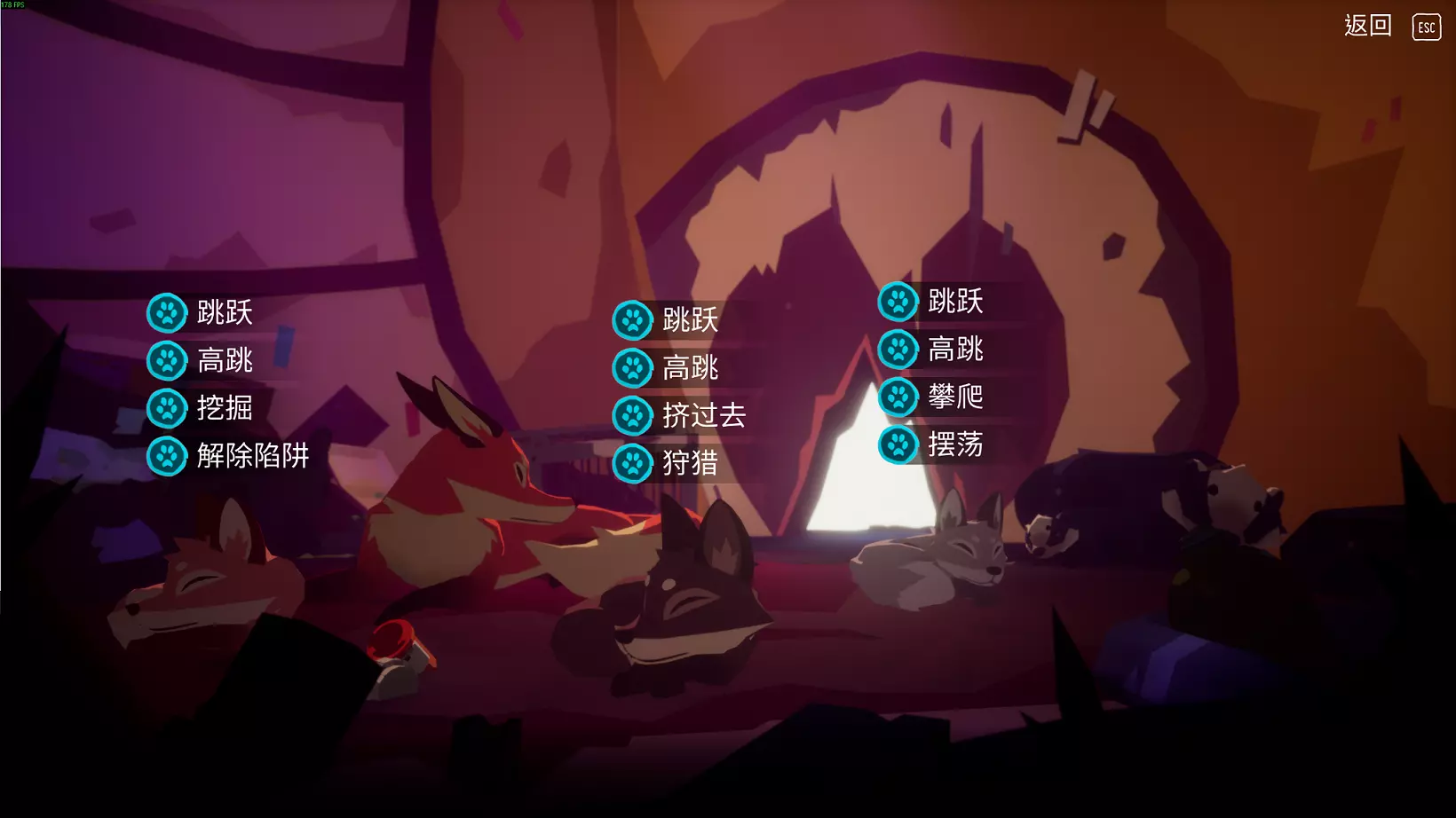 跳跃:第4天晚上自动学习。 高跳:第22天晚上自动学习。 挖掘:在河流区域的下水道中,幼崽会掉进污泥里后解锁。 挤过去:在河流区域跳跃破损的脚手架,幼崽掉下去后解锁。 攀爬:在第15天找气味的时候,到挂着轮胎秋千的树屋,爬上树解锁。 狩猎:在森林区域跳上小屋旁边的笼子,继续走,在幼崽掉进一个有老鼠的笼子里解锁。 摆荡:在垃圾堆集装箱上面的鸽子后面,发现鸟蛋解锁。 解除陷阱:在游戏接近尾声时,在巢穴入口掉进三角形的陷阱解锁(不是普通的夹子陷阱)。 总结