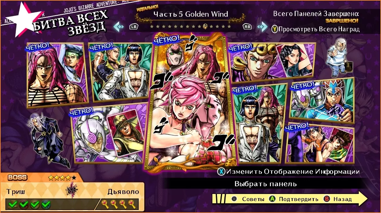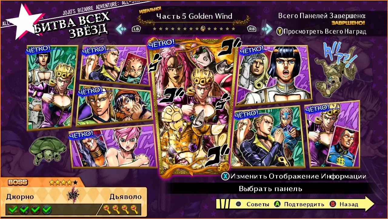 乔鲁诺 vs 布加拉提 难度:★☆☆☆☆ 1. 攻击对手的替身。 2. 使用技能【没用没用没用没用!】。 普罗修特和贝西 vs 繁藤滋树 难度:★★★☆☆ 1. 进行帅气闪避。 2. 使用GHA。 3. 完成HHA。 福葛 vs 纳兰迦 难度:★★☆☆☆ 1. 击倒对手。 2. 进行帅气闪避。 3. 使用特殊技能【紫烟扭曲】。 特里休 vs 虹村形兆 难度:★★★☆☆ 1.布奇拉提 vs 瓦伦泰 难度:★★★☆☆ 1. 使用技能【合上拉链/Close, zipper!】 2. 使用特殊技【我抓住你了/I've got you!】 3. 使用抓取技【从审讯到拷问/From interrogation to torture】 普罗修特和贝西 vs 米斯达 难度:★★☆☆☆ 1. 进行反击 2. 打出5连击 3. 完成GHA 乔鲁诺 vs 虹村亿泰 难度:★★★★☆ 1.1. 攻击对手的替身。 2. 进行帅气的闪避。 3. 使用技能【没用没用没用!】。 4. 以HHA获胜 乔鲁诺 vs 迪亚波罗 难度:★★★★☆ 1. 率先攻击。 2. 释放技能【你能逃离毁灭吗?】。 3. 使用技能【你永远无法触及真相!】。 4. 用技能【没用!】获胜。 黄金之风(第二部分)
