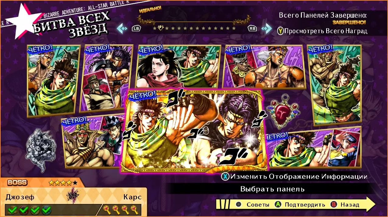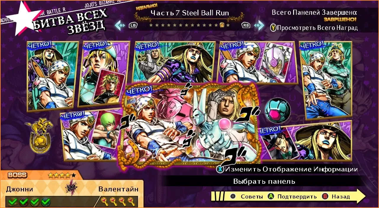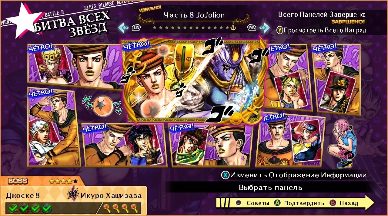 乔瑟夫8世 vs 乔纳森 难度:★★★☆☆ 1. 击倒对手。 2. 完成帅气闪避。 3. 终结HHA。 乔瑟夫8世 vs 乔瑟夫 难度:★★★☆☆ 1. 进行反击。 2. 执行嘲讽。 3. 终结HHA。 乔瑟夫8世 vs 空条承太郎 难度:★★★★☆ 1. 打出10连击。 2. 攻击对手的替身。 3. 终结HHA。 4. 用GHA获胜。 乔瑟夫8世 vs 乔瑟夫4世 难度:★★★☆☆ 1. 一局不败获胜。 2.完成一次帅气的闪避。 3. 完成GHA。 乔瑟夫8世 vs 乔鲁诺 难度:★☆☆☆☆ 1. 率先发起攻击。 2. 打出5连击。 乔瑟夫8世 vs 空条徐伦 难度:★★☆☆☆ 1. 率先发起攻击。 2. 打出10连击。 3. 完成GHA。 乔瑟夫8世 vs 乔尼 难度:★☆☆☆☆ 1. 一局未失赢得胜利。 2. 使用GHA。 乔瑟夫8世 vs 伊奇洛 难度:★★★★☆ 1. 一局未失赢得胜利。 2. 进行反击。 3.激活竞技场陷阱。 4. 以戏剧性终结获胜。