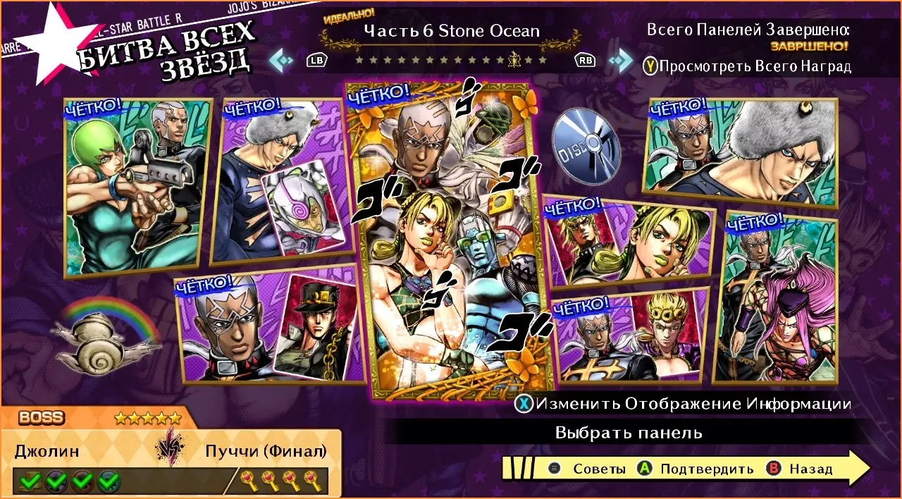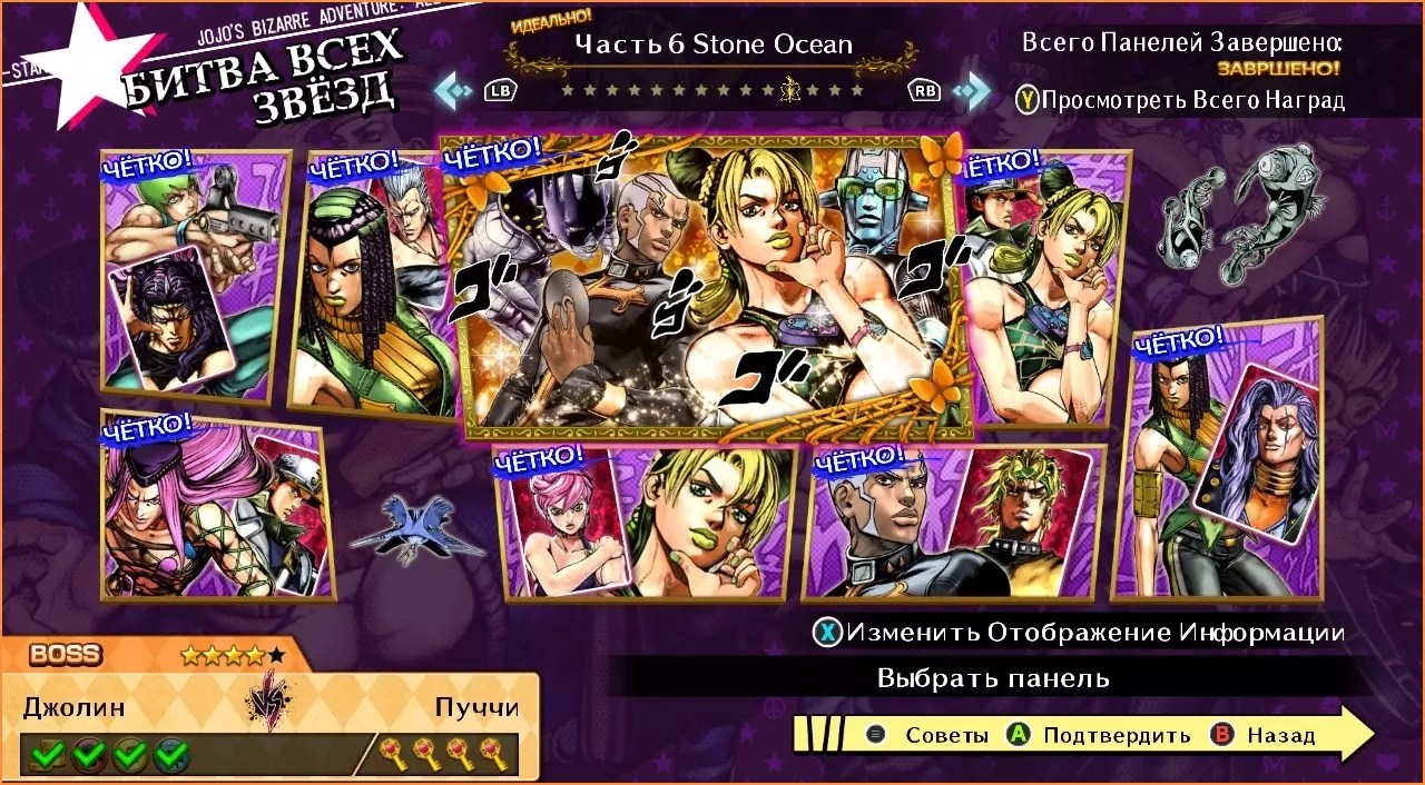 F.F vs 卡兹 难度:★★★☆☆ 1. 使用风格【我克服了自己的弱点】 2. 打出5连击 3. 以GHA终结 艾梅斯 vs 波鲁纳雷夫 难度:★★★★☆ 1. 使用技能【看招,这才是你的归宿!】 2. 进行反击 3. 以GHA终结 4. 以HHA获胜 安波里欧 vs 承太郎(第四部) 难度:★★☆☆☆ 1. 完成帅气闪避 2. 在替身模式下使用普通攻击 3.使用技能【血肉悬浮】。 空条徐伦 vs 特莉休 难度:★☆☆☆☆ 1. 率先发起攻击。 2. 使用特殊技【把我串起来!】。 普奇 vs DIO 难度:★★★☆☆ 1. 不丢失任何一局并获胜。 2. 使用GHA。 3. 使用技能【我命令你!】。 空条徐伦 vs 空条承太郎(第四部) 难度:★☆☆☆☆ 1. 击倒对手。 2. 攻击对手的替身。 艾梅斯 vs 安杰罗 难度:★★★☆☆ 1.使用闪光取消。 2. 打出5连击。 3. 完成GHA。 空条徐伦 vs 恩里克·普奇 难度:★★★★☆ 1. 攻击对手的替身。 2. 激活场地陷阱。 3. 每回合都不丢失光盘并获胜。 4. 用GHA获胜。 石之海(第2部分)