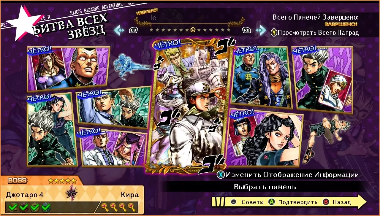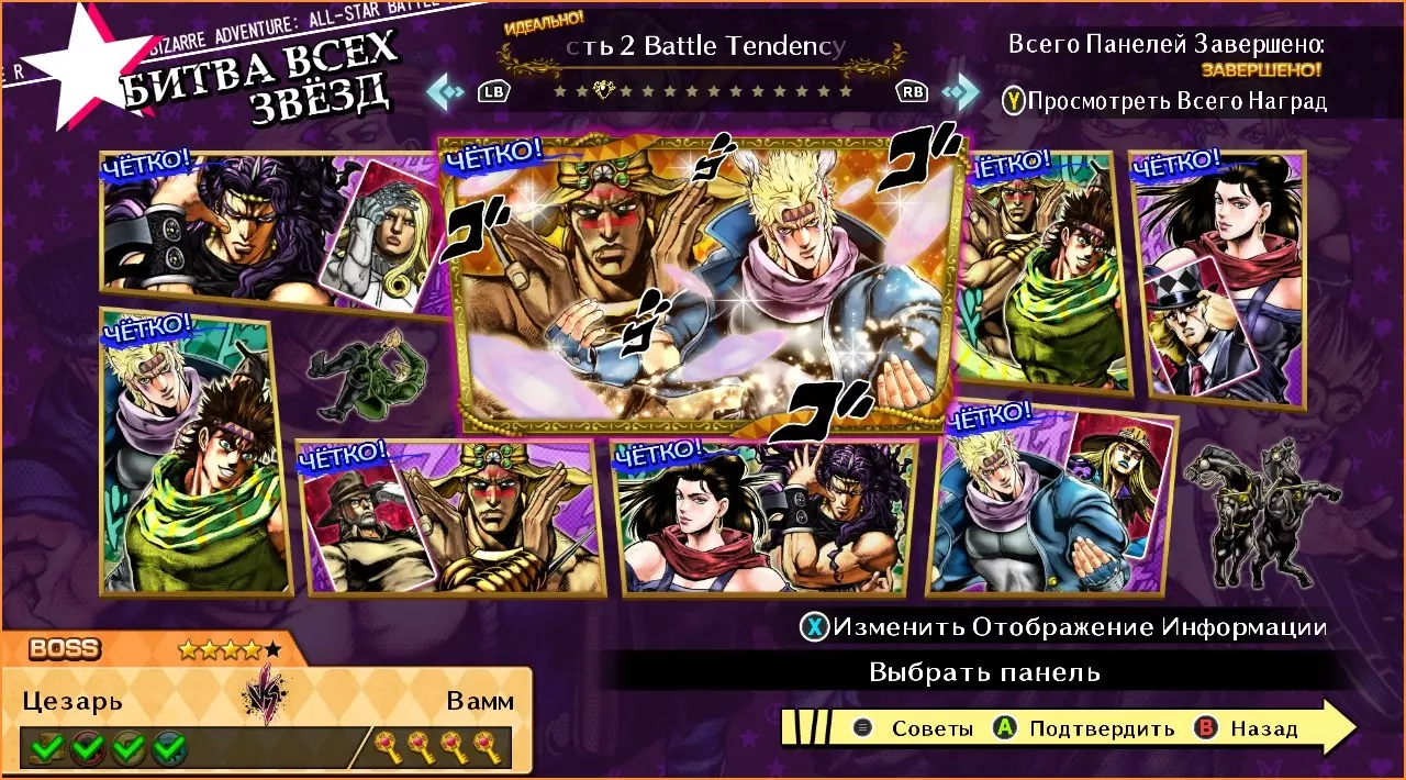 迪奥 vs 乔瑟夫 难度:★★★☆☆ 1. 执行嘲讽。 2. 使用特殊技【你不过是条狗】(原词:Ты просто собака/you are a mere dog!)。 3. 使用技能【汽化冷冻】(原词:Испаряющее замораживание/vaporizing freeze)。 乔纳森 vs 史比特瓦根 难度:★★☆☆☆ 1. 率先发起攻击。 2. 使用风格【波纹呼吸】(原词:Дыхание хамона/Hamon Breathing)。 3. 使用特殊技【伸缩拳】(原词:Приближающийся удар/Zoom Punch)。 西撒 vs 迪奥 难度:★☆☆☆☆ 1. 打出5连击。 2. 使用抓取技【砰】(原词:Пув/Pow)。乔纳森 vs 乔鲁诺 难度:★★★☆☆ 1. 不丢失任何一个回合并获胜。 2. 使用【波纹呼吸】风格。 3. 使用【幸运与勇气之剑】技能。 西撒 vs 乔纳森 难度:★☆☆☆☆ 1. 使用特殊技【坐姿跳跃】。 2. 使用特殊技【伸缩拳】。 迪奥 vs DIO 难度:★★★★☆ 1. 打出5连击。 2. 攻击对手的替身。 3.使用技能【原地冻结!】。 4. 用GHA获胜。 史比特瓦根 vs 老乔瑟夫 难度:★★★☆☆ 1. 击倒对手。 2. 使用HHA。 3. 使用技能【伙计们,用这些刀子发疯吧!】。 乔纳森 vs DIO 难度:★★★★☆ 1. 先攻。 2. 使用风格【波纹呼吸】。 3. 使用技能【幸运与勇气之剑】。 4. 用HHA获胜。 战斗潮流(第一部分)