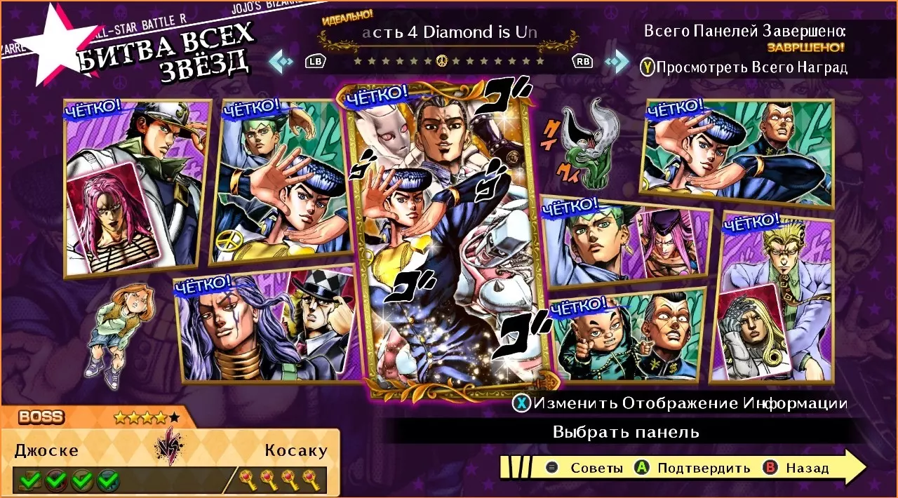 承太郎4 vs 迪亚波罗 难度:★★★☆☆ 1. 使用风格【白金之星·世界!】 2. 打出20连击 3. 以GHA终结 仗助4 vs 岸边露伴 难度:★☆☆☆☆ 1. 进行反击 2. 使用特殊技【我还没踢够你的屁股呢!】 虹村亿泰 vs 史比特瓦根 难度:★★★☆☆ 1. 使用特殊技【右手摇滚】 2. 使用技能【我要把你拖进来!】 3. 使用GHA乔瑟夫4 vs 虹村形兆 难度:★☆☆☆☆ 1. 使用技能【DORA!】 2. 打出5连击 岸边露伴 vs 安波里欧 难度:★★★★☆ 1. 完成华丽闪避 2. 在替身模式下使用普通攻击 3. 使用技能【如果我是漫画英雄会怎么做?】 4. 用GHA获胜 矢安宫重清 vs 虹村形兆 难度:★★☆☆☆ 1. 在替身模式下使用普通攻击 2. 使用HHA使用技能【动一下你就后悔莫及!/Move and you'll regret it!】。 吉良吉影 vs 法尼·瓦伦泰 难度:★★★☆☆ 1. 使用技能【万物皆可炸/Anything can be a bomb】。 2. 使用技能【哈!】。 3. 以GHA获胜。 东方仗助 vs 广濑康一 难度:★★★★☆ 1. 攻击对手的替身。 2. 使用技能【欧拉欧拉欧拉欧拉欧拉!】。 3. 完成HHA。 4. 在HHA发动期间使用【尝尝我的自动追踪导弹吧!/Meet my homing missile!】。 不灭钻石(第二部分)