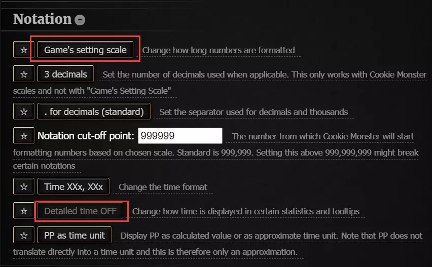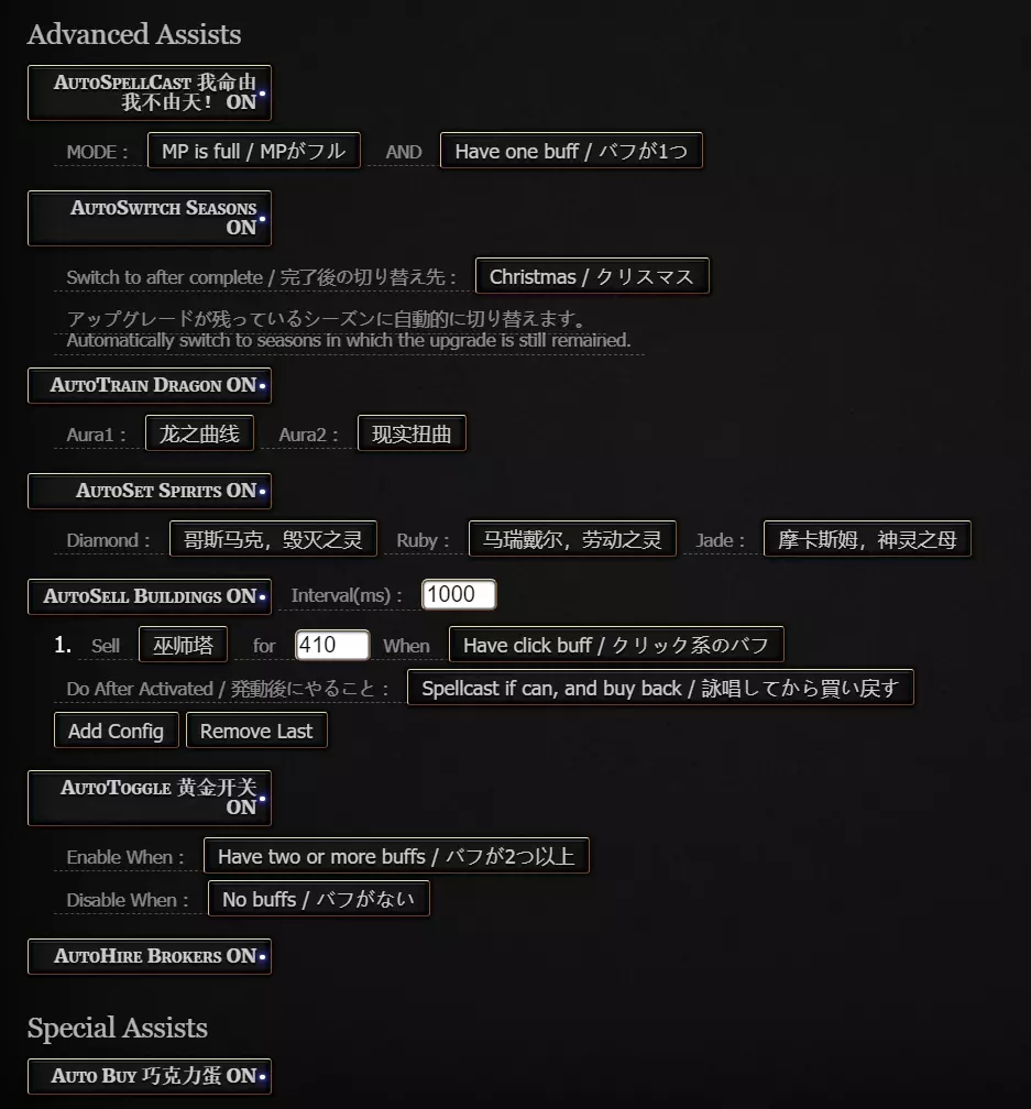 高级设置从上到下依次为: 自动施放【我命由我不由天】(原词:命运之手)。可以设置两个条件,第一个是魔力足够就用/满魔力才用,第二个是有一个增益效果就用/至少有2个增益效果才用,一般选择满魔力,有一个增益效果就用,这样可以进行双发,同时使用频率比较高,出现点击狂热的可能性更大。 自动切换节日。可以选择全部切换一次后固定在某个节日或者不选,一般固定在收益最高的圣诞节。自动切换的判定条件是当前节日全部升级都出现后才会切换,不用担心还没收集完就自动切走了。 自动训练饼干龙。可以指定训练完成后启用的光环,注意只有龙完成训练之后才会启用光环,且仅在拥有多个光环时才会启用。 自动设置万神殿。可根据个人需求进行设置。此处为自动猴戏选择的【卖建筑加点击增益】。 自动出售建筑。需为每个建筑单独设置:先点击【Add Config】添加一条设置,然后设置对应的建筑、数量和卖出条件(总是/至少有1/2/3种增益/有点击狂热增益),还可设置卖出后的操作(施放魔法并买回数量/直接买回数量/不操作)。这个mod最强的功能应该就是自动出售建筑。众所周知,后期刷分数最快的方式是在触发点击狂热增益时,使用命运之手刷新出点击狂热后卖出巫师塔,再用命运之手刷新出建筑增益,接着开启黄金开关,通过这套操作可以叠加7x777x建筑增益x卖出建筑增益x黄金开关增益的巨额增益。通过相关设置可以实现全自动操作:先调整好巫师塔的数量,然后设置好卖出巫师塔的数量,确保卖出后能再次使用命运之手,设置为触发点击狂热时卖出,卖出后使用魔法再买回。这样一旦自动施放的命运之手刷新出点击狂热,就会自动卖出巫师塔并再次施放命运之手以刷新第三个增益。 自动开启黄金开关:可以设置开启条件和关闭条件。虽然理论上有点击狂人增益时开启收益最高,但是同时有两个增益时开启黄金开关的收益也不算低了,所以我的设置是至少2种增益时开启,没有增益时关闭。 自动雇佣经纪人(股票市场)。特殊设置:自动收获巧克力蛋。 农场和股票自动化 将Cookie Assistant设置好之后,游戏内90%以上的手动内容都能全自动进行,还剩下农场和股票。股票可以使用其他帖子提到的mod进行自动买入卖出,安装启动即可,无需进行设置。 关于农场,由于界面的特殊性,自动播种收获mod只在农场最大等级时才生效。我还没有开始使用这个mod,在农场满级前,推荐使用另一个mod。这个mod可以显示可杂交获得的种子及杂交路线概率,同时拥有自动收获功能。但是这个自动收获是一到成熟期立马收获,对于要用某些生长期很长的植物没错就是老人草进行杂交时会有影响,总之在进行杂交时最好还是手动操作,解锁完成后挂机时再使用。将这些插件设置完成后,基本上不需要进行任何手动操作了,你需要做的就是挂机等待分数增长,手动杂交解锁农场所有种子,看到分数不怎么变化了就飞升下一周目重新来过,直到解锁全成就然后退坑。附加内容 如果有使用了【Cookie Monster】的玩家可能会发现,默认设置里显示了太多不需要的内容,还会修改中文润色mod的文本,并且有频繁的闪光和提示。接下来为大家介绍【Cookie Monster】的部分显示优化方法: 去除底部显示条