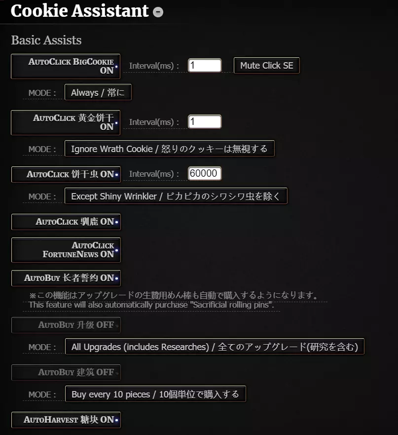 基础设置从上到下依次为: 自动点击大饼干。可以修改间隔时间,有4种模式:总是点击/点击狂热增益中点击/至少1种增益时点击/至少2种增益时点击,一般选择【总是点击】就行 自动点击黄金饼干。也可以修改间隔时间,有2种模式:无视红饼干/红饼干也点击,选择无视红饼干就行,如果要做特殊成就在长者狂热中点击驯鹿的时候建议关闭该项手动点击。 自动戳爆饼干虫。默认间隔时间一分钟,有两种模式:全部都戳/金色饼干冲不戳。根据个人情况选择,不过我一般是开着自动购买长者誓约的的,笑死根本都没有虫子。 自动点击圣诞驯鹿。 自动点击幸运新闻。 自动购买长者誓约。如果要做【老奶奶末日模式】相关成就记得关闭该模式,同时如果开启了节日自动切换,切换到万圣节之后会自动关闭这个选项,需要手动重新开启。 自动购买升级。 自动购买建筑。可以选择购入的单位:10/50/100,这个选项和自动升级我都不开启,因为我更喜欢按照【Cookie Monster】显示的最高效率去购买,另外一个原因就是为了控制巫师塔的数量以保证可以连发【命运之手】。不太在意的玩家可以都打开。 自动收获糖块。妈妈再也不用担心我的糖块自动落下没有变异了。