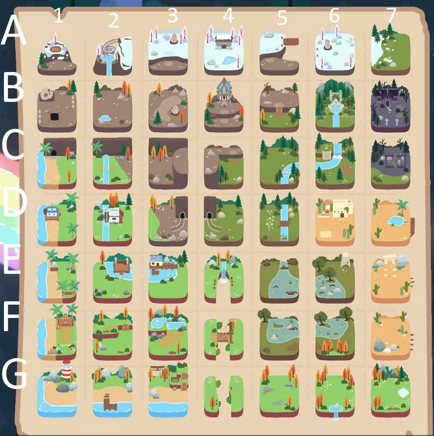 最终你会找到一个便携帐篷。一定要随身携带它,因为你可以在帐篷内部贴满所有你想要的贴纸。(或者用它来“收纳”所有人。) 贴纸很容易找到。有2张贴纸只在完成它们的任务前存在。不过,如果你没有拿到初始形态的贴纸,当你拿到最终形态时它也会解锁。 地图 在整个指南中,我会根据这张地图,用每个世界地图区域的网格代码来指代它们。 这样更容易追踪你的位置。 虽然我的指南会引导你按照特定路径前进,但这肯定不是唯一的路线。