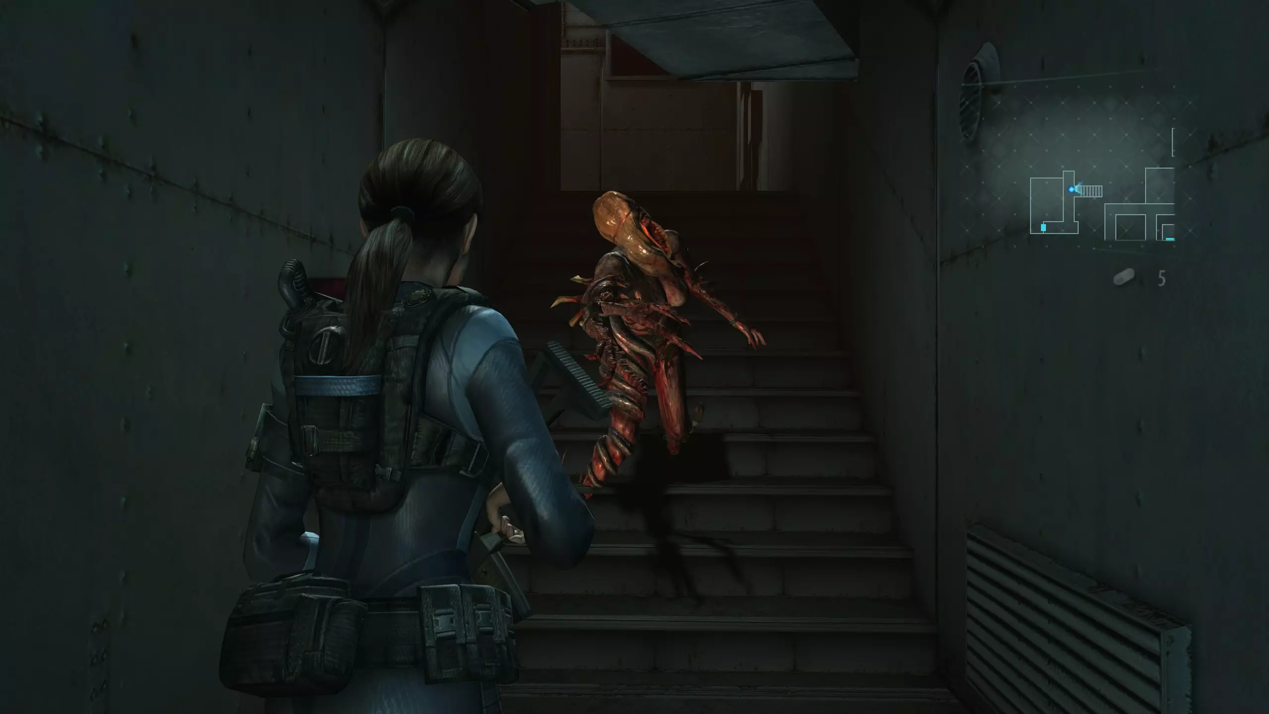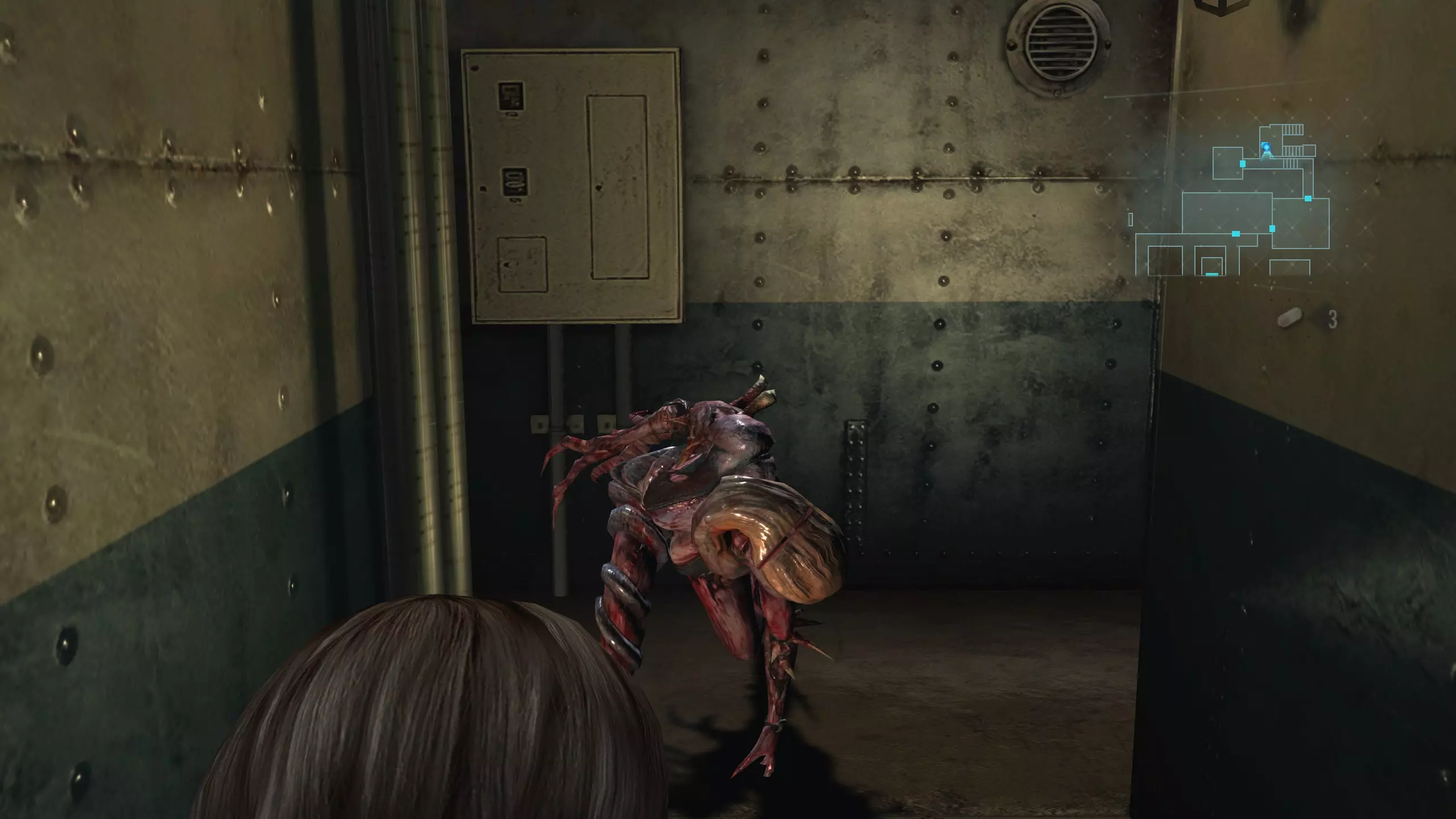 第二处——在船员舱的卫生间里,当你走过房间大半区域时,瑞秋会从上方的通风管道里突然出现,所以你需要转身应对。