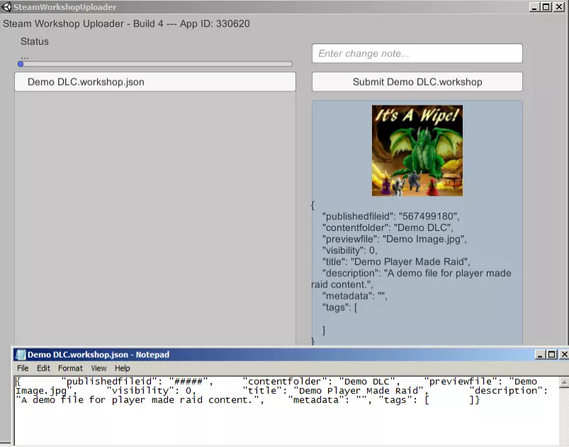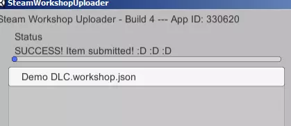 点击workshop.json文件会在文本编辑器中打开它。不要改动publishedfileid,这是你的创意工坊项目的唯一ID。你需要填写以下信息: Contentfolder——这应该是包含你的DLC文件的文件夹名称(位于创意工坊内容文件夹内)。 Previewfile——主创意工坊内容文件夹中的图像文件名称(含扩展名)。文件大小必须小于1MB。建议格式包括JPG、PNG或GIF。 Title——创意工坊内容的标题。 Description——你希望在Steam创意工坊上显示的此内容的描述。 你无需编辑其他字段,也不应更改publishedfileid。设置好json文件后,在【修改说明】字段中填写当前版本的相关备注,然后点击【提交】按钮。状态显示会告知你上传是否成功。据报告,即使所有配置都正确,有时也可能出现上传失败的问题。如果遇到问题,你可以检查是否已登录Steam,或者尝试重启应用程序。理想情况下,你会看到类似这样的提示。