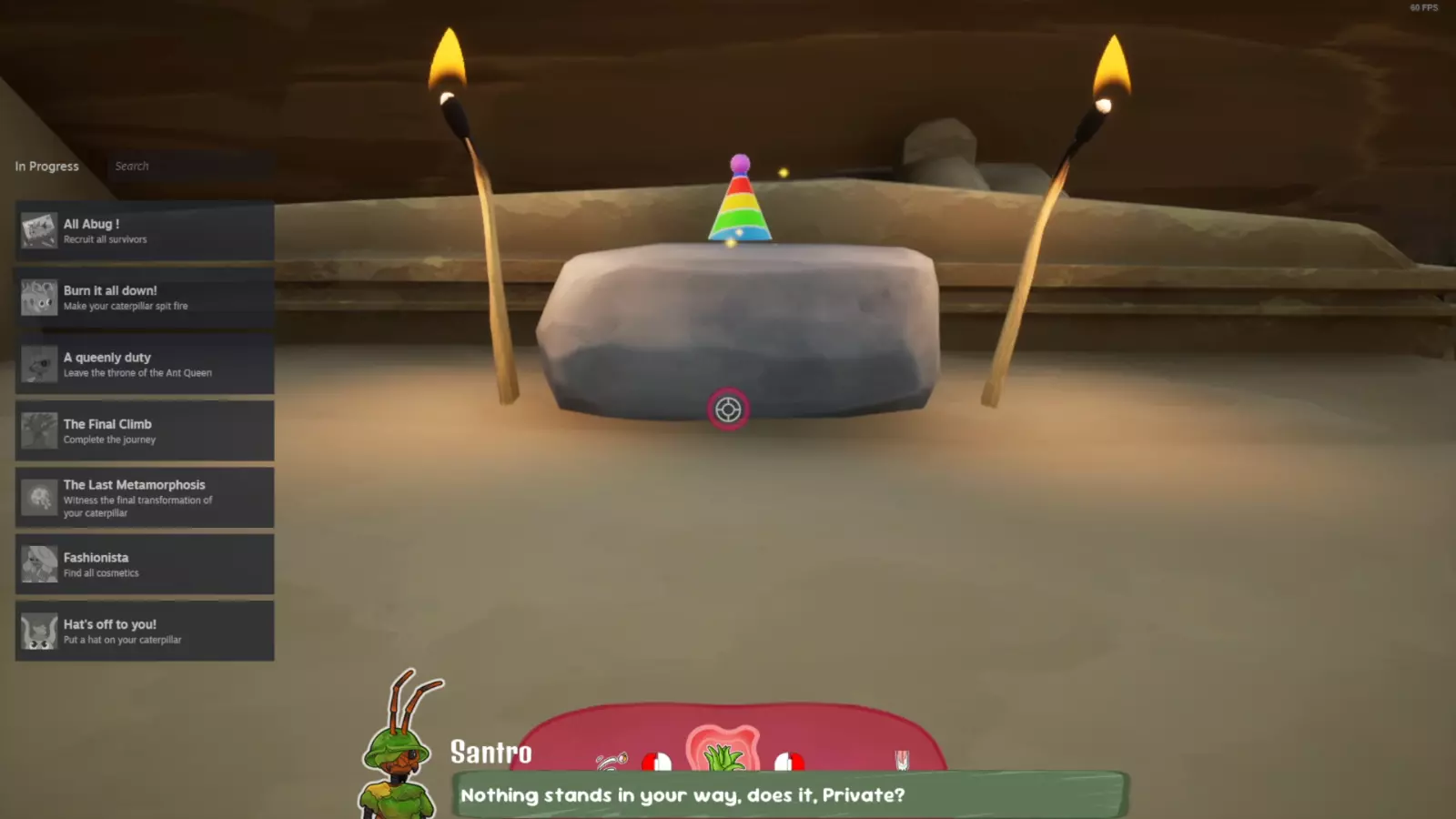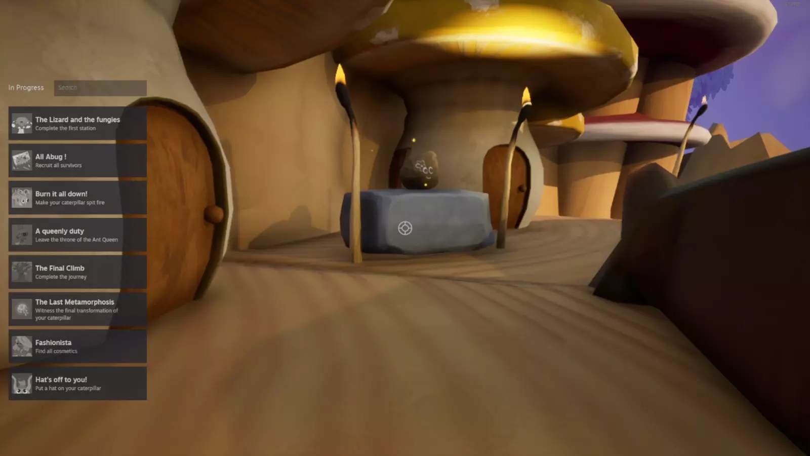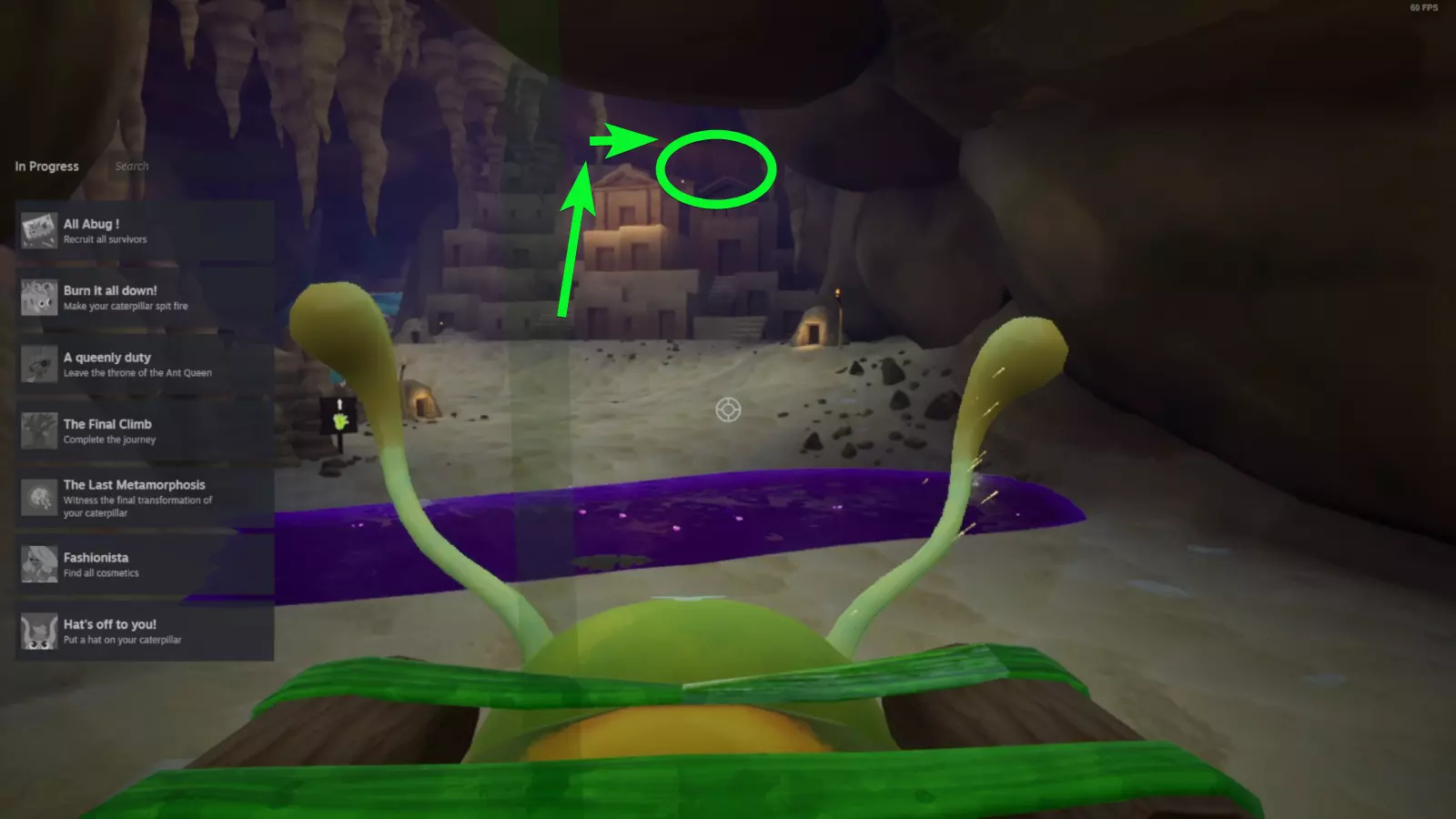 这是《All Abug!》的收集品指南,介绍了治疗毛毛虫前的收集品获取位置:第一站登顶可拿帽子,还展示了游戏中栅栏、蘑菇区域、遗迹场景里的收集品点位,包括装饰帽子、圣剑等收集物,帮助玩家完成收集类成就。