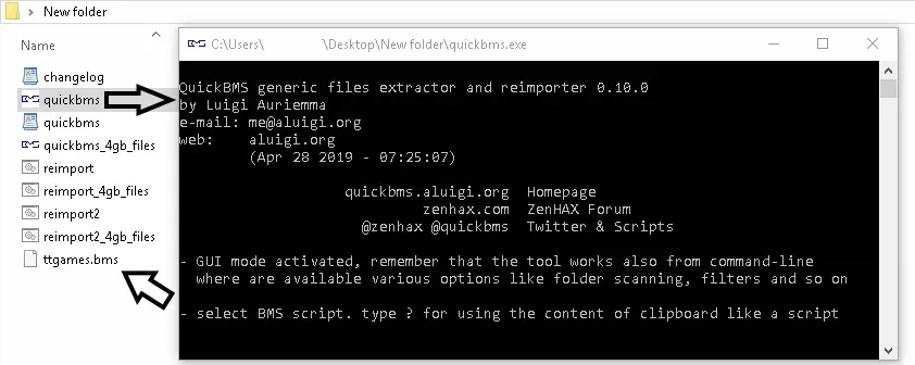 3.将下载的文件放入一个新文件夹,然后打开quickbms.exe。打开后,程序会要求你提供一个BMS脚本,只需选择ttgames.bms即可。