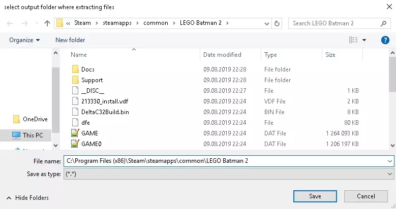 现在会要求你选择输出文件夹。直接将其解压到你的游戏文件夹中。游戏文件夹的位置同样是C: Program Files (x86) Steam steamapps common Lego Batman 2