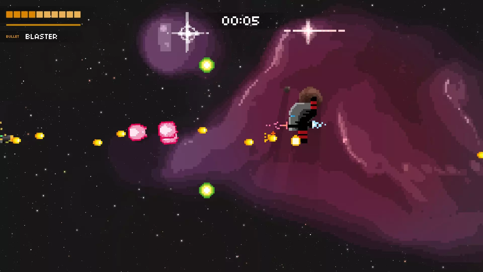 你可以通过让他追着你跑来延长第一次挥剑猛击的时间,或者靠近他来提前触发。无论哪种情况,他都会传送到你附近开始挥剑攻击——在他挥剑前,向远离他的方向闪避1-2次即可应对。在他的第一次剑连击时,只需朝着 Boss 方向闪避穿过那些圆形弹幕就能躲开。下一次连击中的圆形弹幕也可以用同样的方法躲避。后一次连击中的旋转方形弹幕,可以等它们稍微分开一点后,闪避着冲向 Boss;将他引到角落,让部分弹幕被障碍物摧毁也会有所帮助。 攻击2