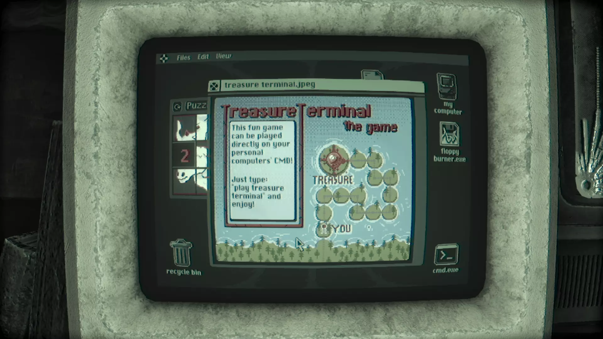 (如果你找到的是第一个TheTruth.txt文件,将会播放一段过场动画,游戏中的第三个也是最后一个怪物Grinster会回归并激活。如果你不清楚它的机制,可以查看【怪物】部分。) 第四个文件:TheTruth4.txt + 3张恢复的图片 + 1段恢复的音频: 前往【我的电脑】中的【图片】文件夹。在那里你会看到一个命令提示符游戏【TreasureTerminal】的说明以及一张地图。