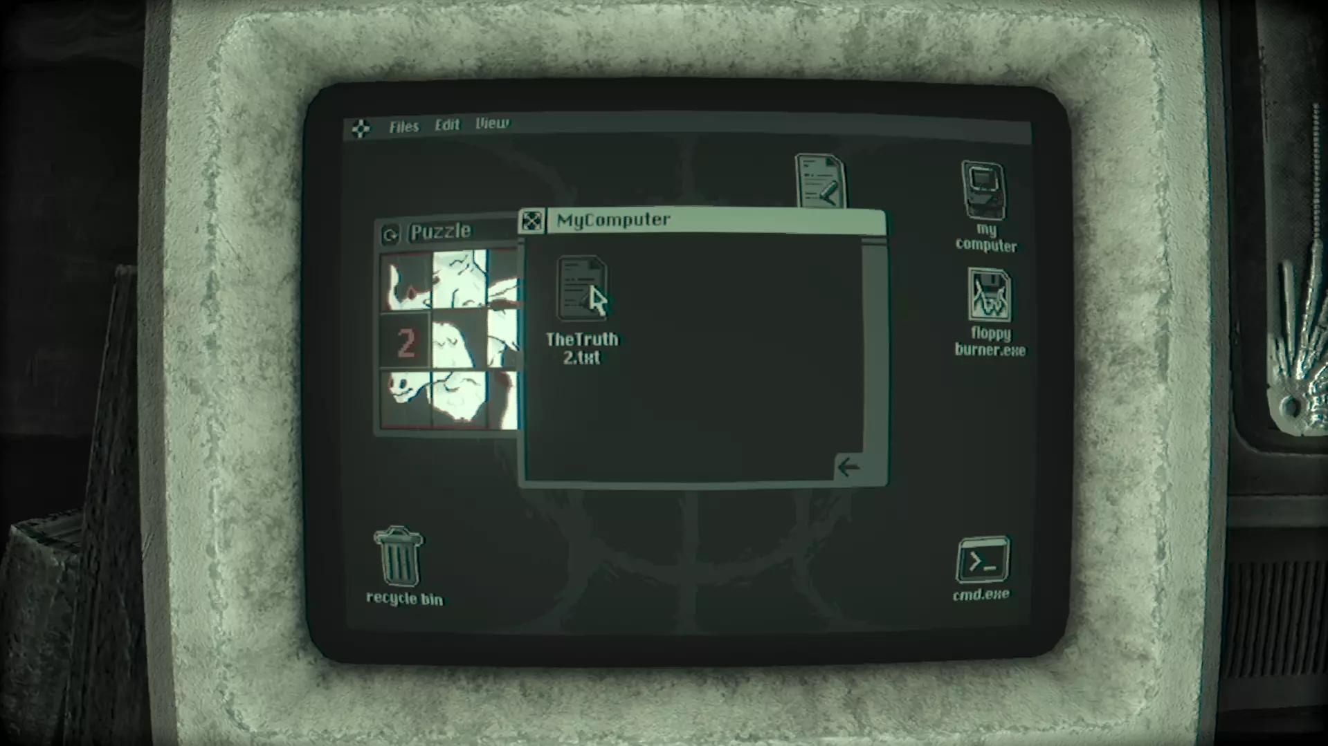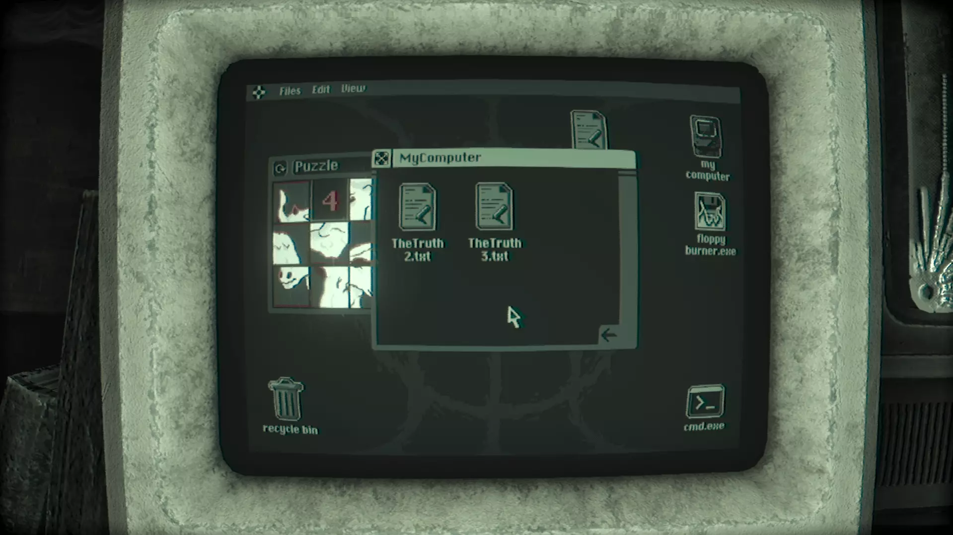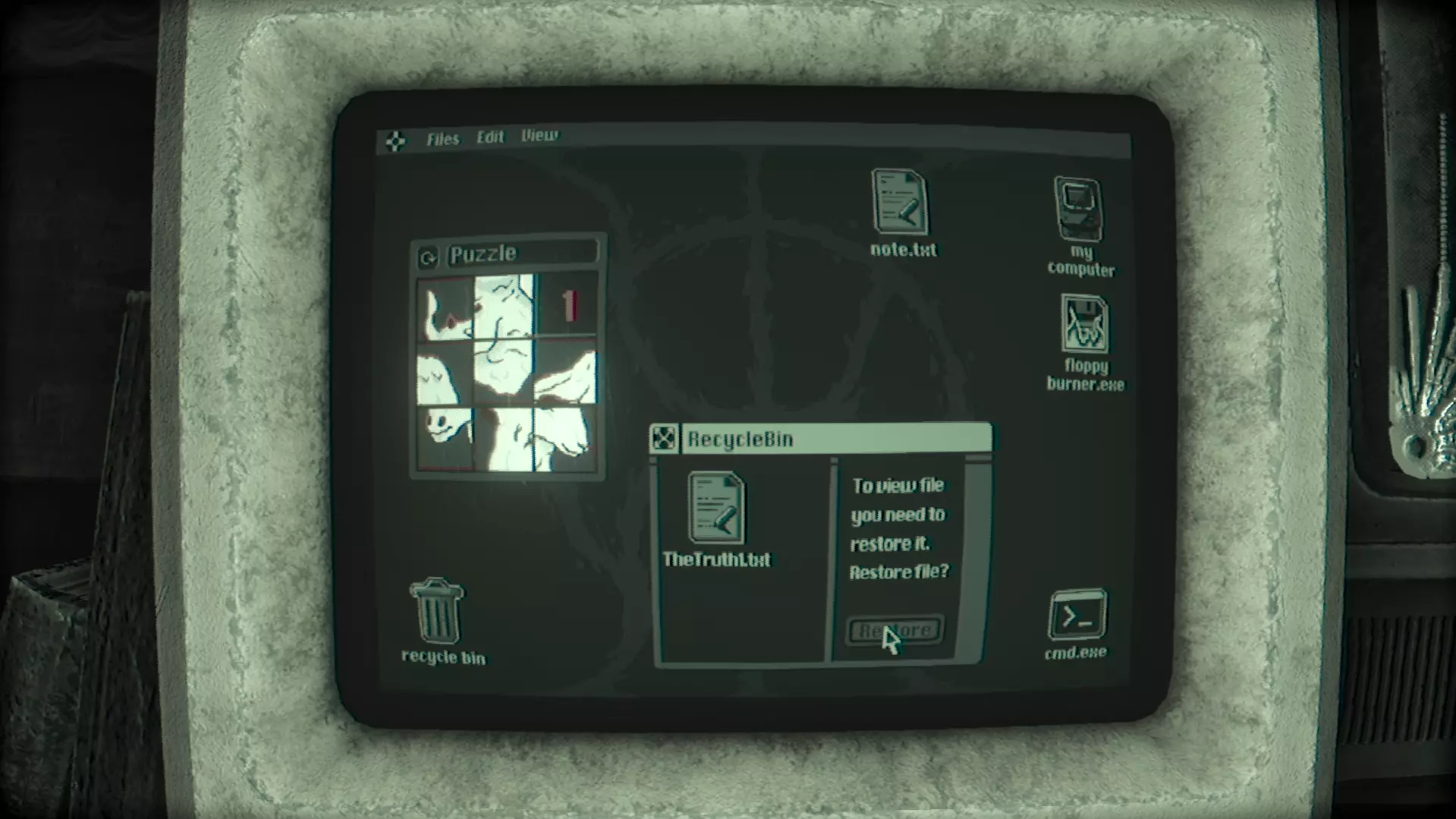 在那里你会找到TheTruth4.txt文件。打开它。 (如果你是第一次找到TheTruth.txt文件,将会播放一段过场动画,游戏中的第三个也是最后一个怪物Grinster会回归并激活。如果你不清楚它的机制,可以查看【怪物】部分。) 除了文本文件外,还有一个名为【Eye】的监控应用程序。打开它并恢复文件。