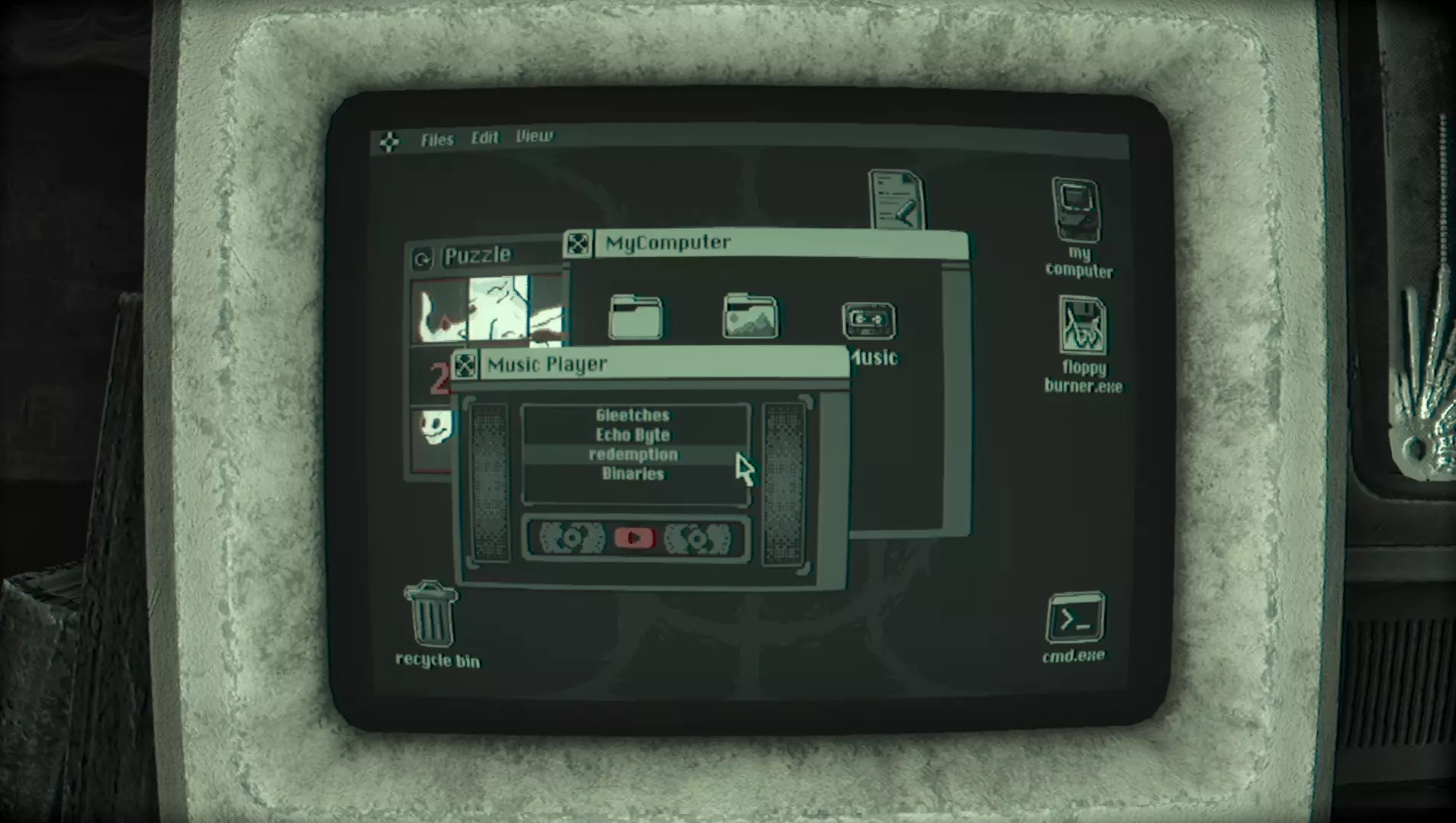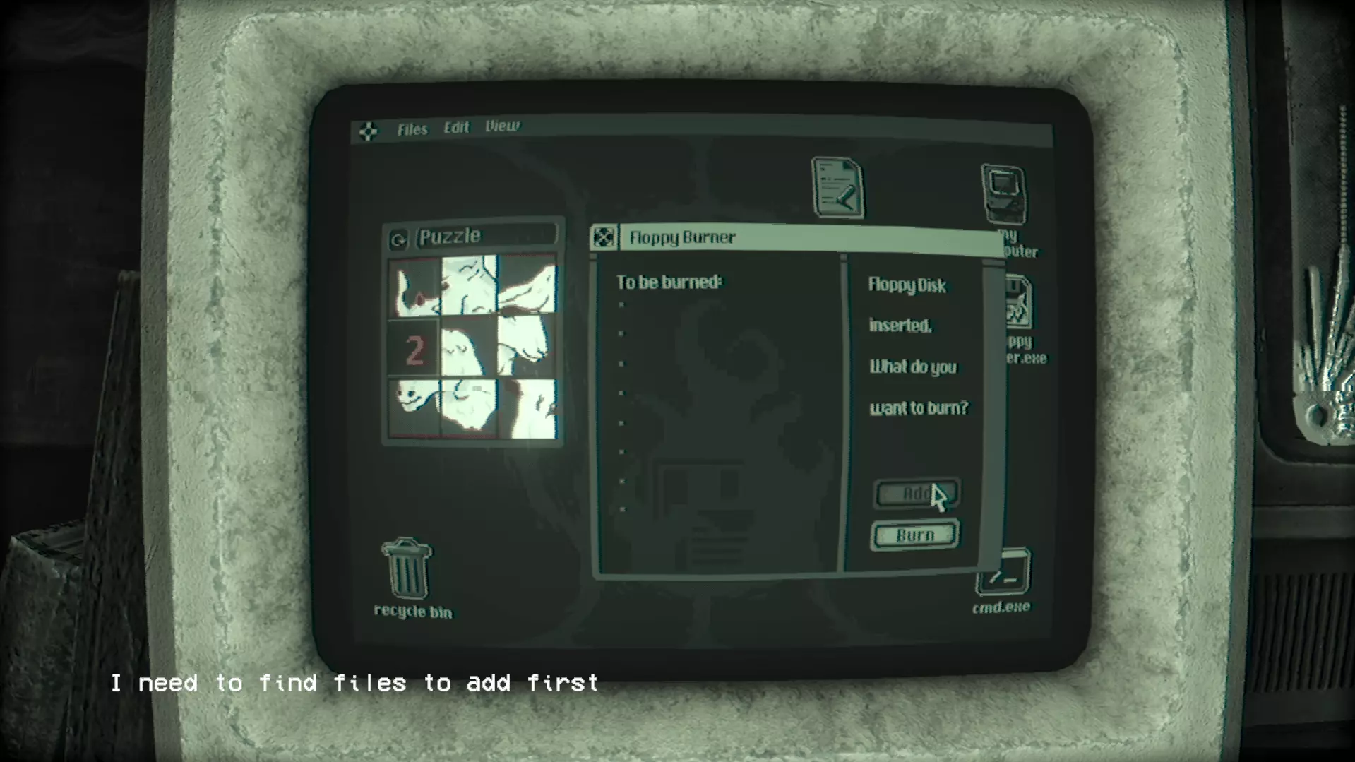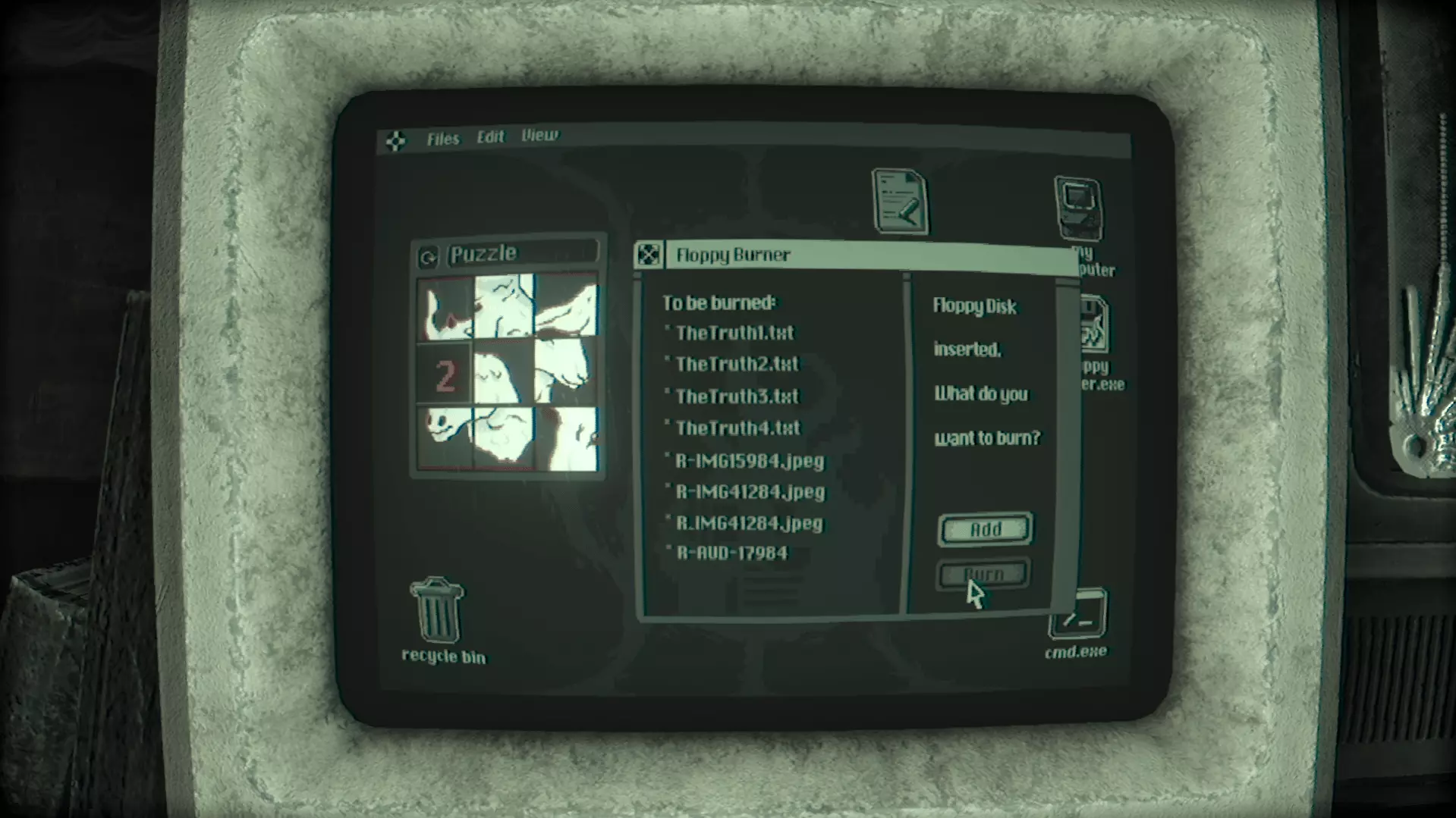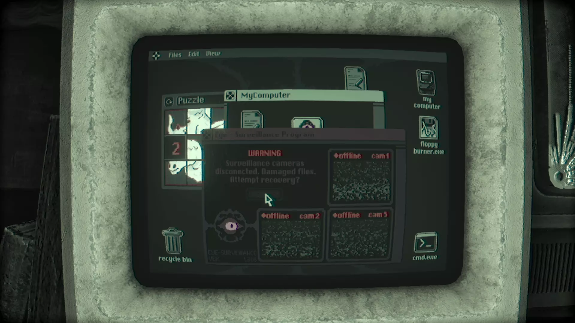 在那里你会找到TheTruth4.txt文件。打开它。 (如果你是第一次找到TheTruth.txt文件,将会播放一段过场动画,游戏中的第三个也是最后一个怪物Grinster会回归并激活。如果你不清楚它的机制,可以查看【怪物】部分。) 除了文本文件外,还有一个名为【Eye】的监控应用程序。打开它并恢复文件。