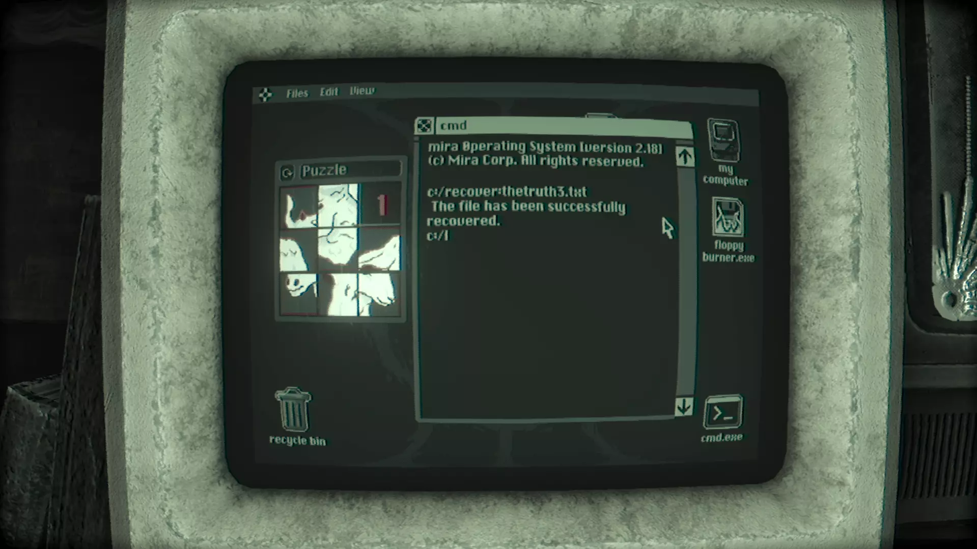 (如果你是第一次找到TheTruth.txt文件,将会播放一段过场动画,游戏中的第三个也是最后一个怪物Grinster会回归并激活。如果你不清楚它的机制,可以查看【怪物】部分。) 第三个文件:TheTruth3.txt 桌面上有一个【note.txt】文件,里面写着你需要打开CMD应用程序,输入“recover:”,然后加上第三个文件名。所以,在CMD中输入“recover: thetruth3.txt”。空格和大写字母不影响。如果操作正确,CMD会提示你。之后,在【我的电脑】里的【Texts】文件夹中查看该文件。