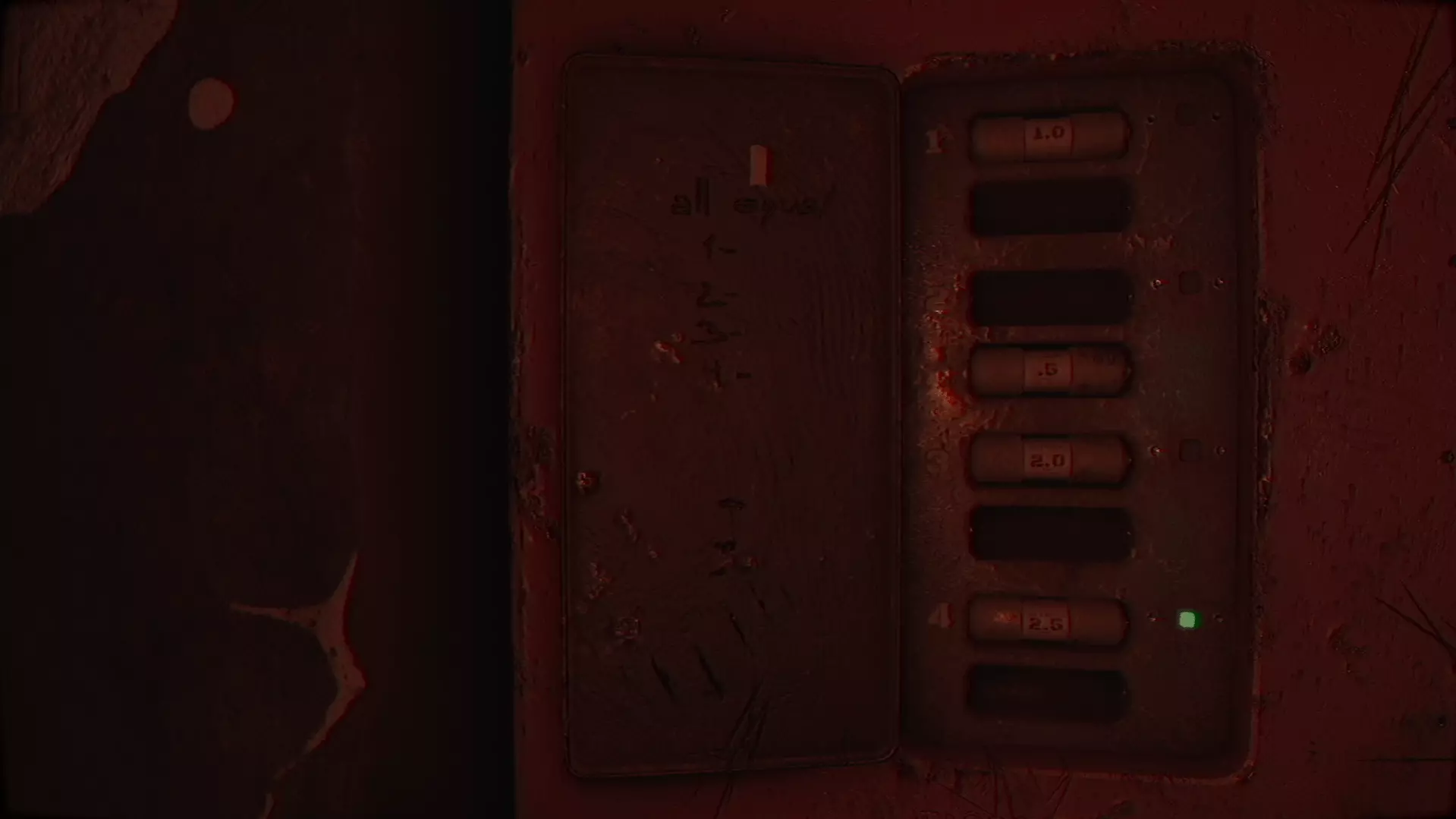 保险丝: 左侧门上写着“全部等于1-、2-、3-、4-”。保险丝盒中有4对保险丝,均标有数字1-4,且已安装的保险丝无法取出。若你解开了电压谜题,2.5保险丝指示灯将会亮起。你需要点亮其他的保险丝对,因此所有保险丝对的数值都需等于2.5。 根据上述信息,将0.5保险丝用于已插入2.0保险丝的那一对,1.0保险丝用于已插入1.5保险丝的那一对,1.5保险丝用于旁边插有1.0保险丝的插槽。