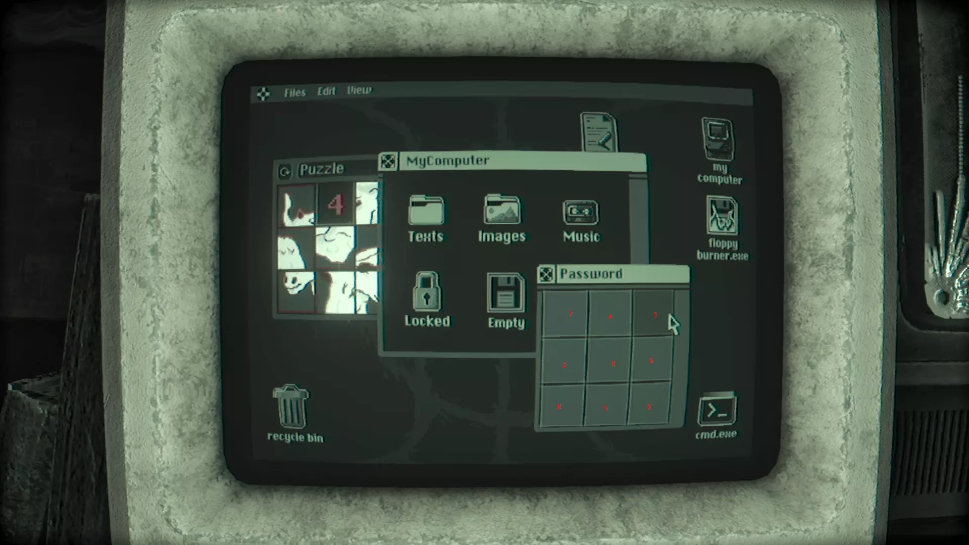 (如果你找到的是第一个TheTruth.txt文件,将会播放一段过场动画,游戏中的第三个也是最后一个怪物Grinster会回归并激活。如果你不清楚它的机制,可以查看【怪物】部分。) 第二个文件TheTruth2.txt: 位于【我的电脑】中的【Texts】文件夹内。关于密码,请查看桌面绵羊3x3谜题背后的数字。