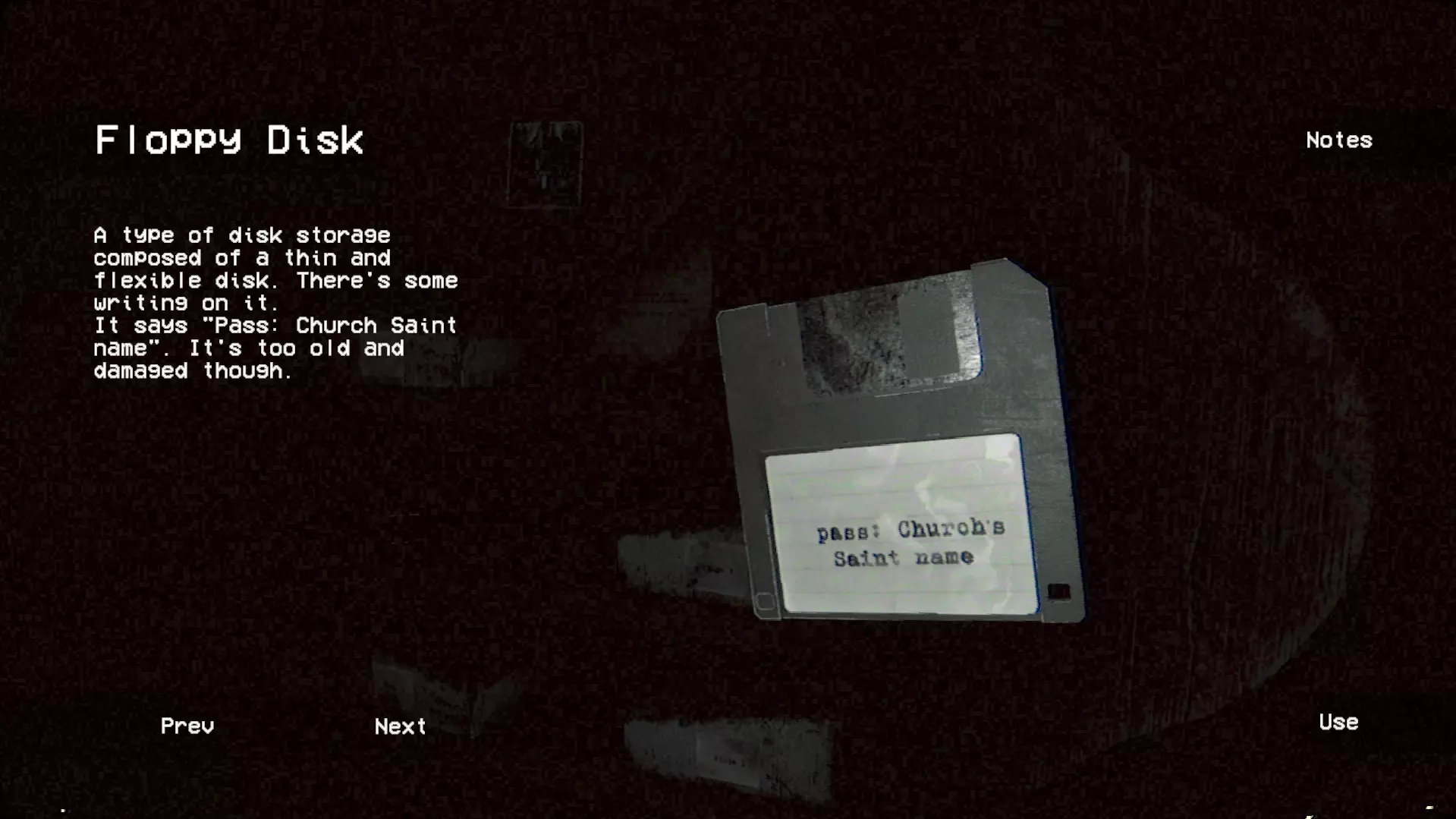 如果你还没有【十字右半部分】,从通风口出来后会触发一段过场动画。下一个怪物【Chopp】已被激活。如果你不清楚它的机制,可以查看【怪物】部分。 十字凹陷橱柜: 将两个十字部件都用在它上面。拿走软盘。你暂时无法使用它,但上面写着:密码:教堂的圣人名字。