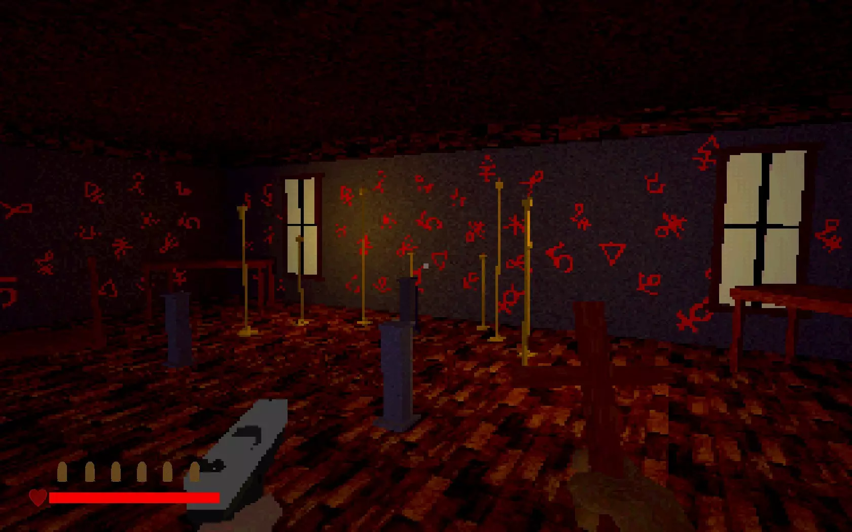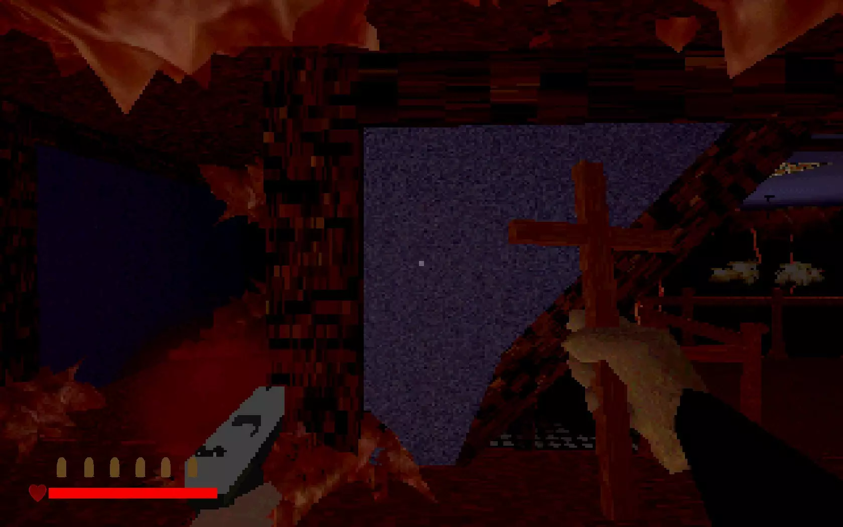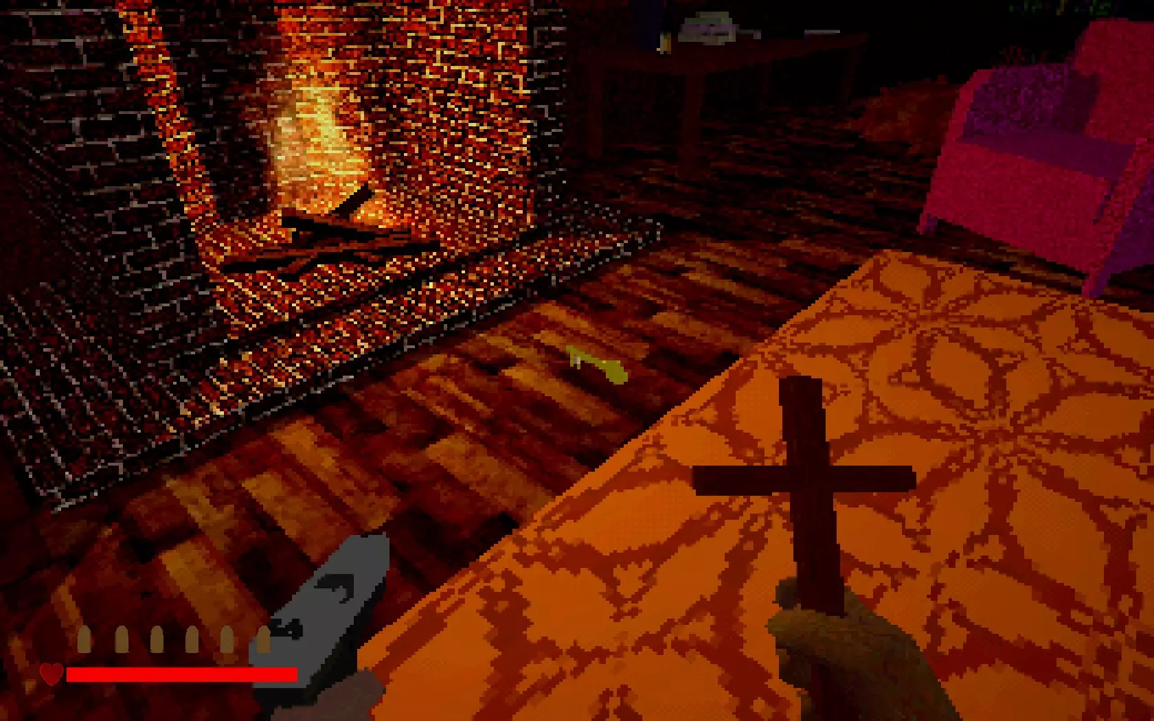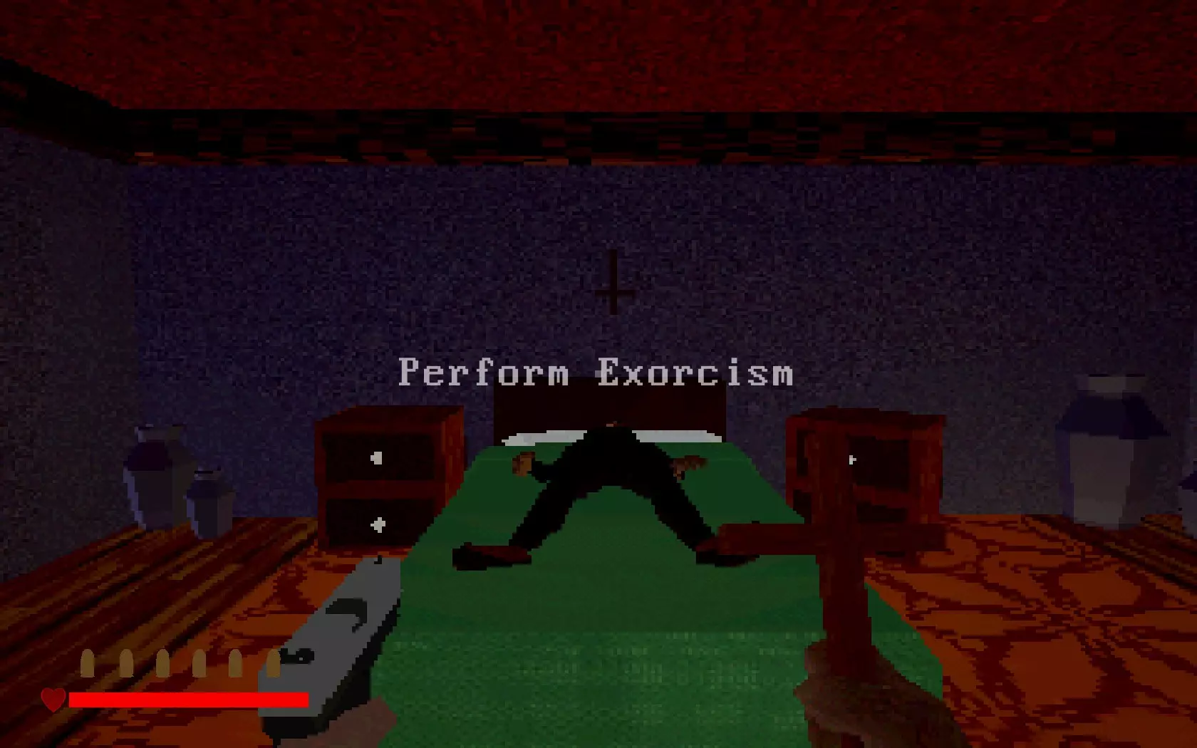 神父自由了……但恶魔现在已挣脱束缚,进入了屋内。走出房间,你就会明白这意味着什么。墙上长出的肉块是恶魔挣脱后的副作用。你可以用十字架清除这些肉块!瞄准它们并按住右键,直到其燃烧殆尽。