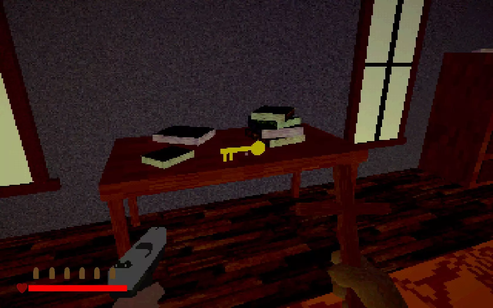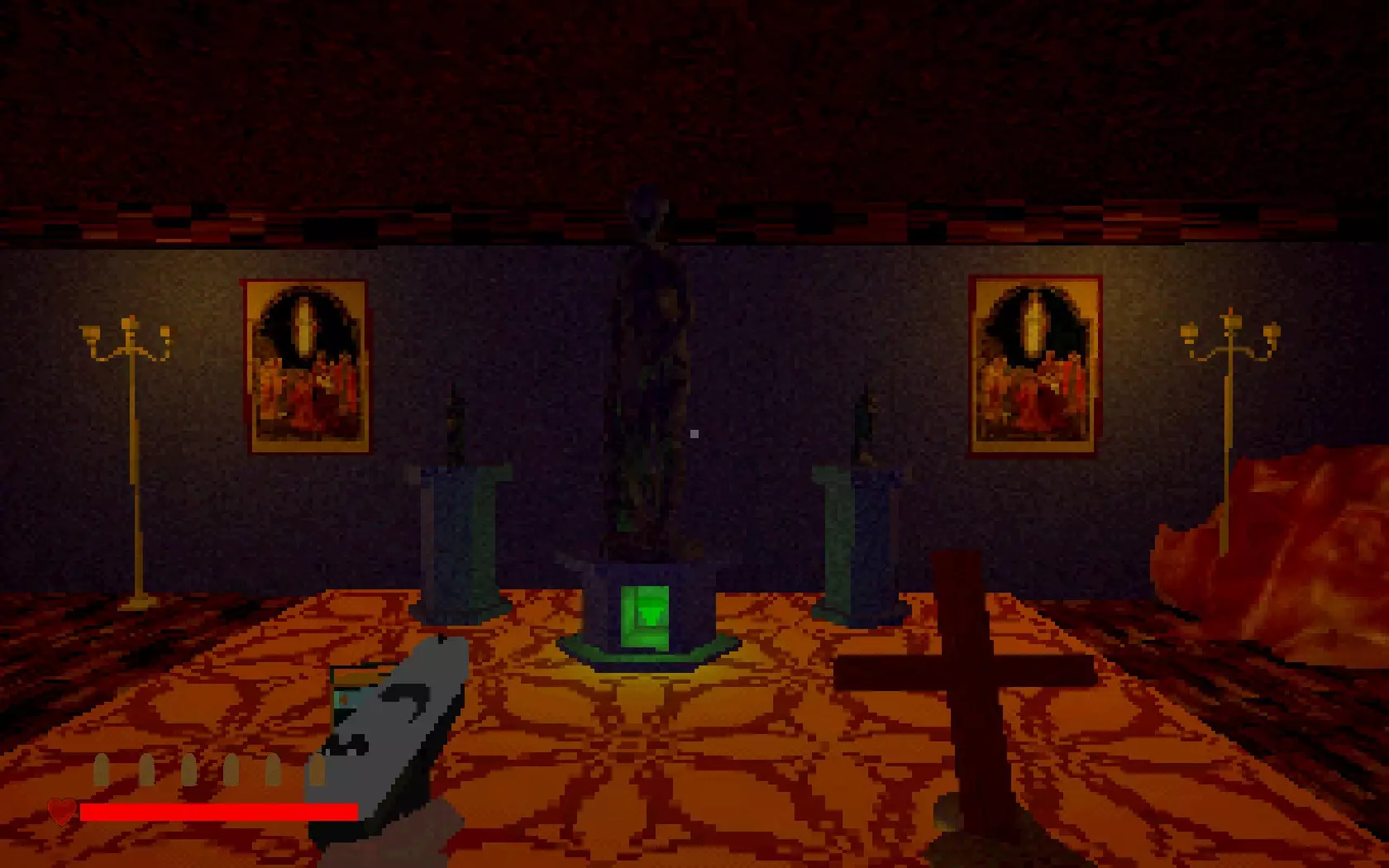 首先是绿色水晶 走出房门,来到走廊的另一边。你会在右手边发现一扇门,打开它并进入。 你的左边有一座雕像。对着雕像祈祷(按E键)可以恢复生命值。当你生命值较低时,可以过来祈祷。 你面前的桌子上会有一把金钥匙。 这把钥匙是用于【雕像】房间的。