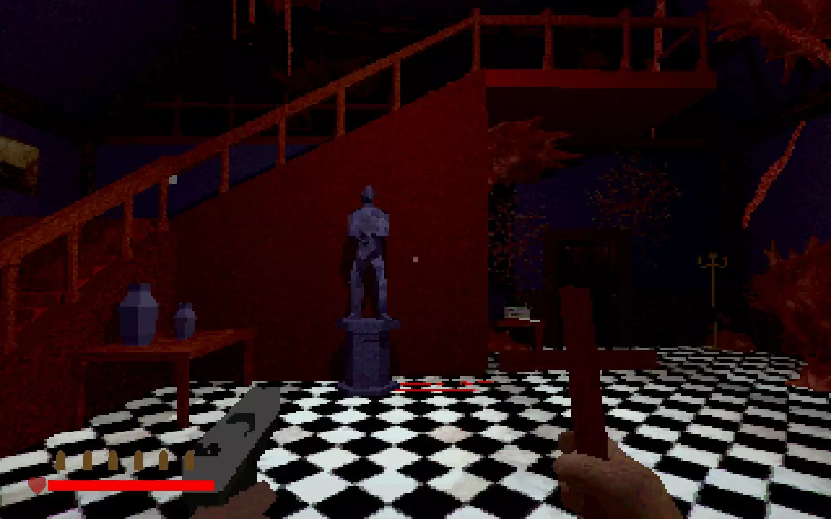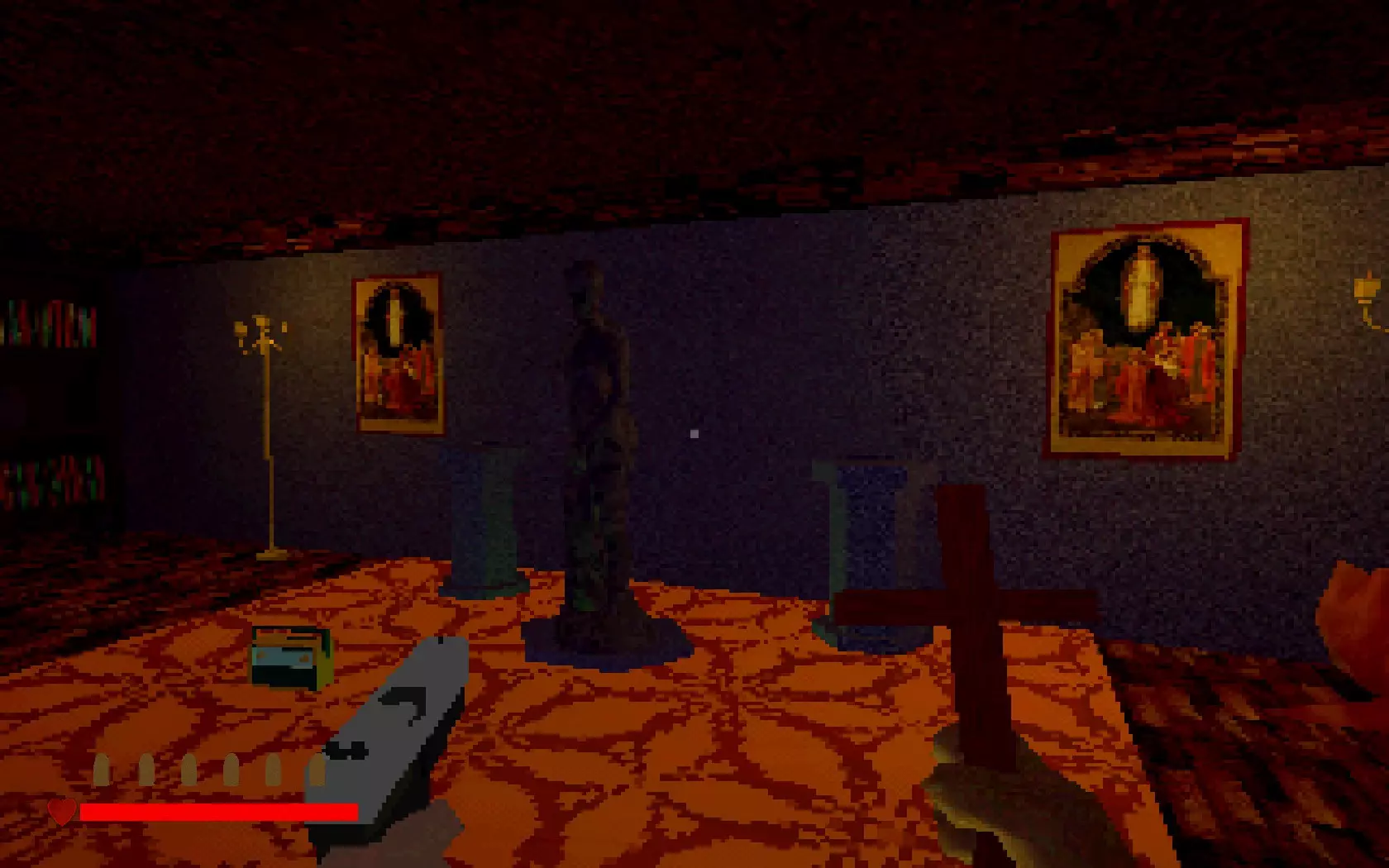 回到走廊右侧(神父房间所在的位置),然后向右走。 你的左手边会是雕像室。在这里你会找到两个放置小型雕像的位置。你必须找到并归还它们。