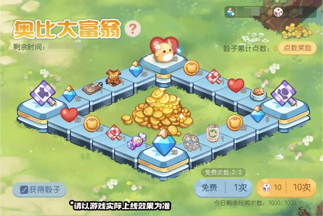 活动介绍:夺宝时间到!奥比大富翁活动限时开启,通过投掷骰子获得点数,小精灵会根据点数进行跳跃,前进到目的地格子将会获得对应奖励。