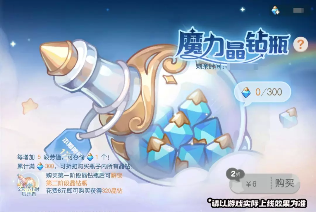 温馨提醒:各阶段晶钻瓶在活动期间内只能购买1次,魔力晶钻瓶存储的晶钻不会累积至下一期活动