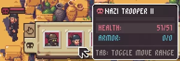 生命值:57(变体II);69(变体III) 护甲:23(变体II);34(变体III) 武器:手枪 特殊能力:为自身或他人恢复+25生命值(变体I)、+35生命值(变体II)、+45生命值(变体III)。可恢复25生命值,既能用于自身,也能用于其他盟友。 备注:如果医疗兵是地图上最后一个敌人,你可能会陷入令人沮丧的猫鼠追逐,因为他会逃跑、治疗、再逃跑、再治疗等。如果你有装备狙击步枪的角色,使用伏击(守望)可以使其一回合无法行动,从而阻止这种猫鼠戏码。 变体II比医疗兵I要强大得多,因为它拥有更高的生命值和护甲。不要指望能一击消灭医疗兵II,即使使用史诗武器也不行。传奇武器或许可以做到。 纳粹士兵
