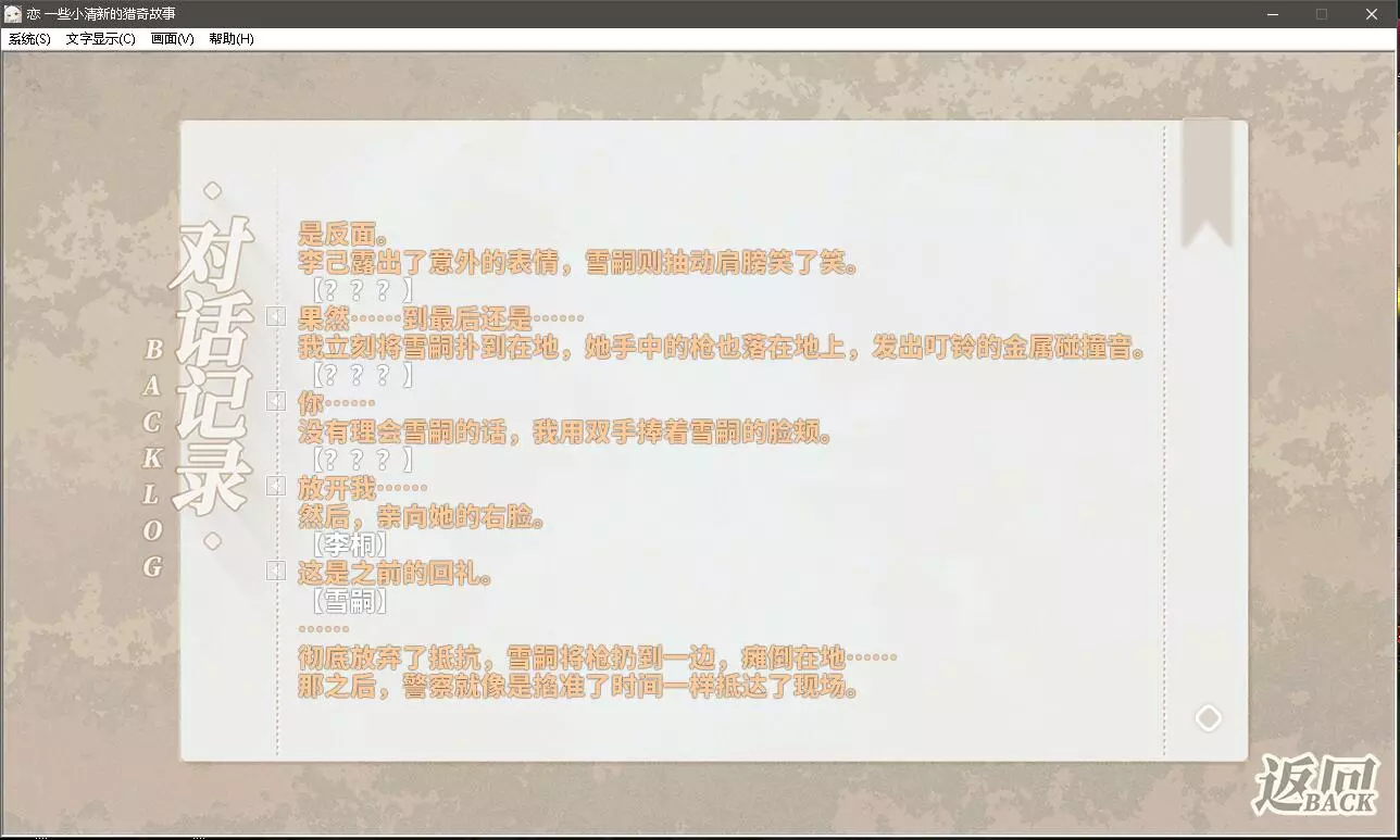 李己决定让雪嗣看看奇迹,一百次抛硬币全部正面朝上。李桐则是分散雪嗣的注意力,慢慢靠近雪嗣。在这个世界线硬币当然只会正面朝上啦,这就是故事的设定了。终于在第100次的时候,硬币是反面了,也是千钧一发之际,李桐扑到了想要开枪自尽的雪嗣,将故事开头雪嗣亲吻自己的那一份还给了她。此处真的也需要CG。 最后警察姗姗来迟。在这一条世界线里没有人员伤亡了,已经算是美好的结局了。(大概?)后记 至此,对于第一个故事【回忆之物】的梳理就结束啦。 第一次写指南可能有很多不好的地方,见谅。