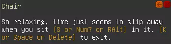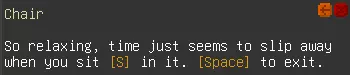 显示输入绑定文本可以通过[]显示当前绑定的操作按键。翻译时,请勿更改[]内的字符串,该部分不会显示给玩家。 阻止教程 椅子=太舒服了,坐在[down]上时,时间仿佛悄然流逝。按[exit_chair]离开。
