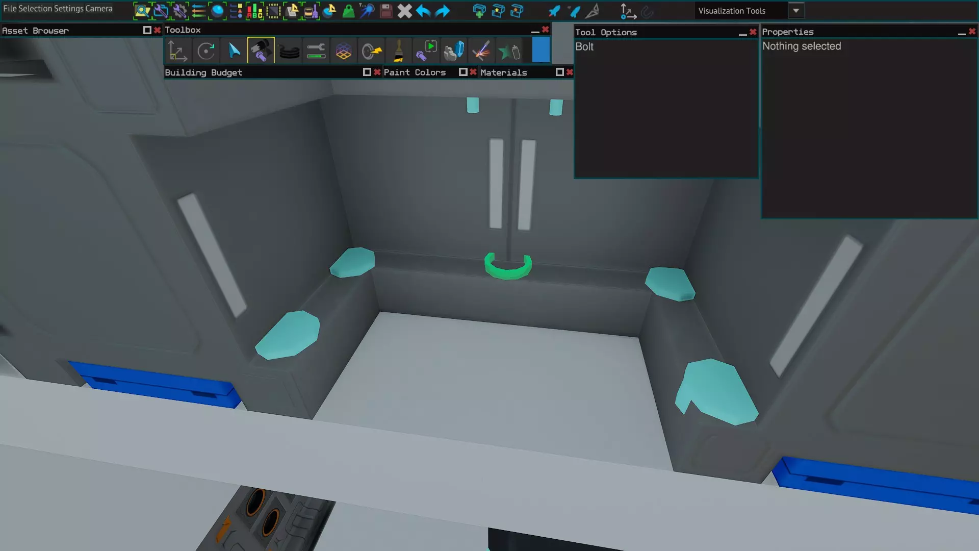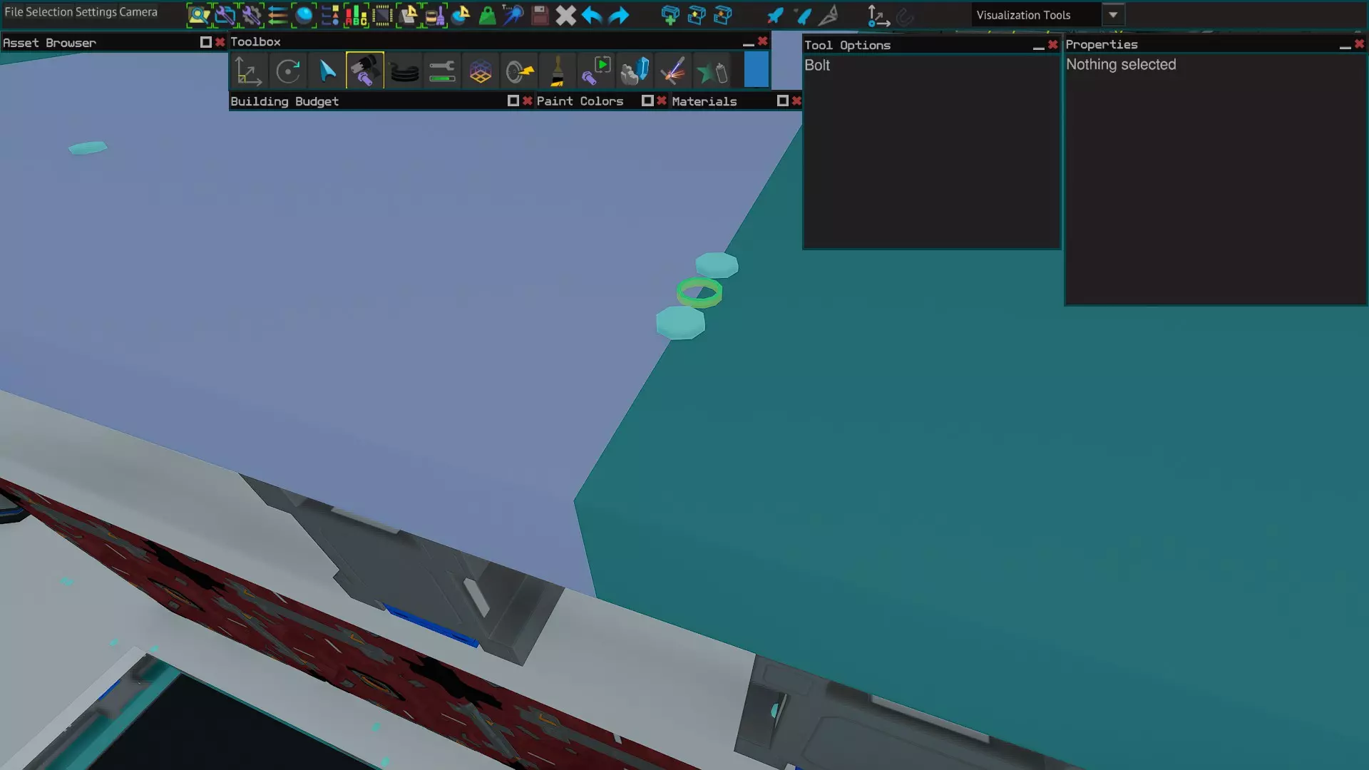 管道螺栓连接是指使用管道工具将管道穿过物体,然后将物体设为不可见并穿过管道进行螺栓连接。这使得原本无法在物体内部放置螺栓的情况成为可能。完成后,你可以使用管道工具移除管道(不要点击删除),从而在保留螺栓的同时去除管道。此外,如果你正在对脆弱物品进行螺栓连接,事后保留管道而不是移除它们有时可以提高飞船强度(我不完全确定其中原因,但可能是因为它将负载分散到了更多部件上)。 插槽螺栓连接 插槽螺栓连接的工作方式与管道螺栓连接类似,但能更好地控制螺栓的放置位置。确保在插座工具[8]的选项中勾选【单独端点放置】。然后放置一个插座。接着使用选择[3]、移动[1]和旋转[2]工具,将插座放置在你想要用螺栓连接的部件之间。之后隐藏除设备外的所有物体,并通过插座放置螺栓。完成后,用插座工具右键点击(不要删除插座)来移除插座,这样螺栓就能保留下来。这对于在板材内部隐藏螺栓,或者在没有横梁的情况下连接玻璃部件非常有用。 飞行螺栓