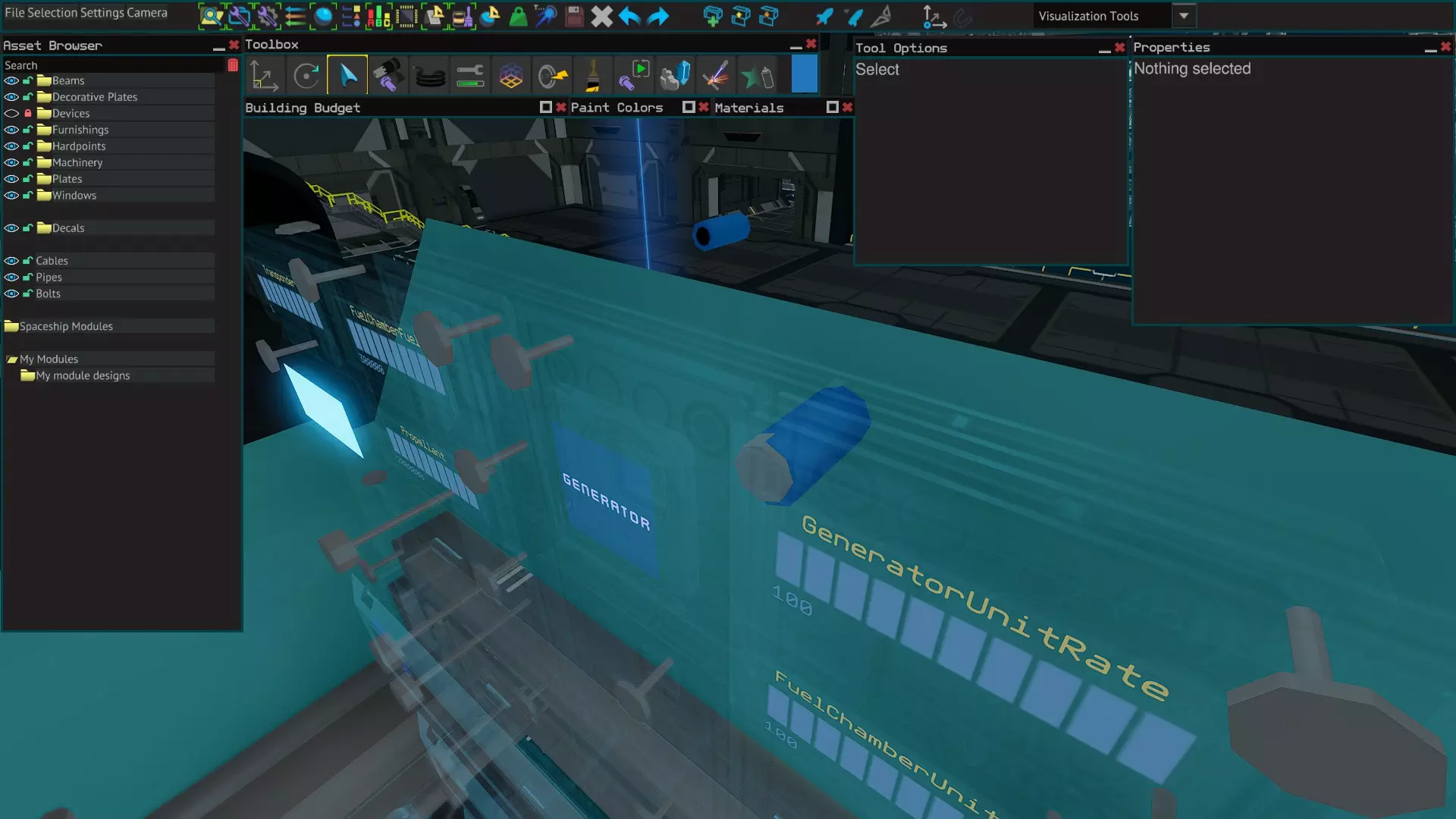 另一种螺栓连接方式是从空心部件(如货箱和推进剂罐)的内部进行。如果你正在设计一个结构紧凑且包含许多已放置部件的装置,这种方式会很实用,因为在这种情况下从外部可能难以看清连接位置。别忘了使用资源浏览器中的【隐藏】功能,以便更好地查看螺栓的放置位置。 接缝螺栓连接