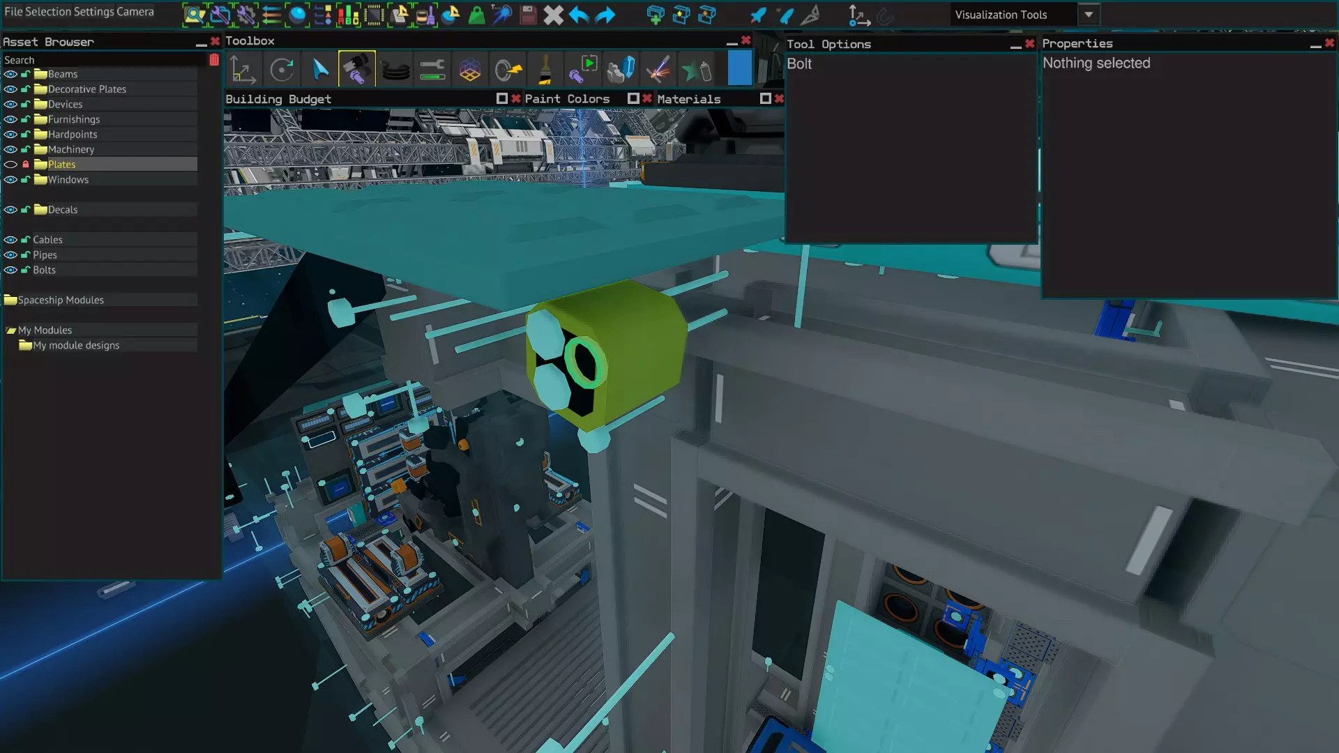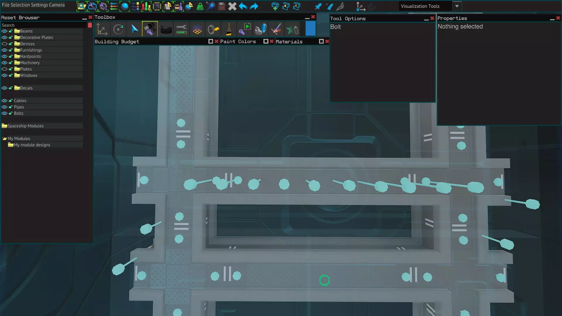 电缆的使用方式与管道螺栓类似,但只能容纳一个螺栓。不过,若要在原本无法放置螺栓的位置进行精确螺栓定位,你可以先将电缆按所需螺栓的朝向放置,然后通过【Ctrl+X】剪切和【Ctrl+V】粘贴,将电缆(及螺栓)精确放置在你想要的位置。 最终说明 螺栓阻碍物体放置 如果你希望在已有螺栓阻碍的位置放置物体,可以在资源浏览器中锁定并隐藏螺栓来实现。 关于焊接块的说明 焊接块现在有时会替代螺栓使用。它们各有优缺点,哪种更合适取决于具体情况。 - 当连接梁时,焊接块会像梁一样传递应力。 - 焊接块会从建造预算的零件数量中扣除。不是螺栓数量的问题。 - 焊接块比螺栓更重。 - 进行蓝图填充区域维修时,焊接块无法像螺栓那样通过U工具自动替换。 - 隐藏的焊接块在游戏中不像隐藏的螺栓(可自动拆除)那样容易移除。这根据具体情况可能是优点也可能是缺点。 - 焊接块还有其他用途,例如填充梁间隙——详见单独指南。 总结 通用规则: 始终将部件用螺栓固定到梁上。 让螺栓穿过多个部件并固定到梁上,能让飞船获得更高的强度。