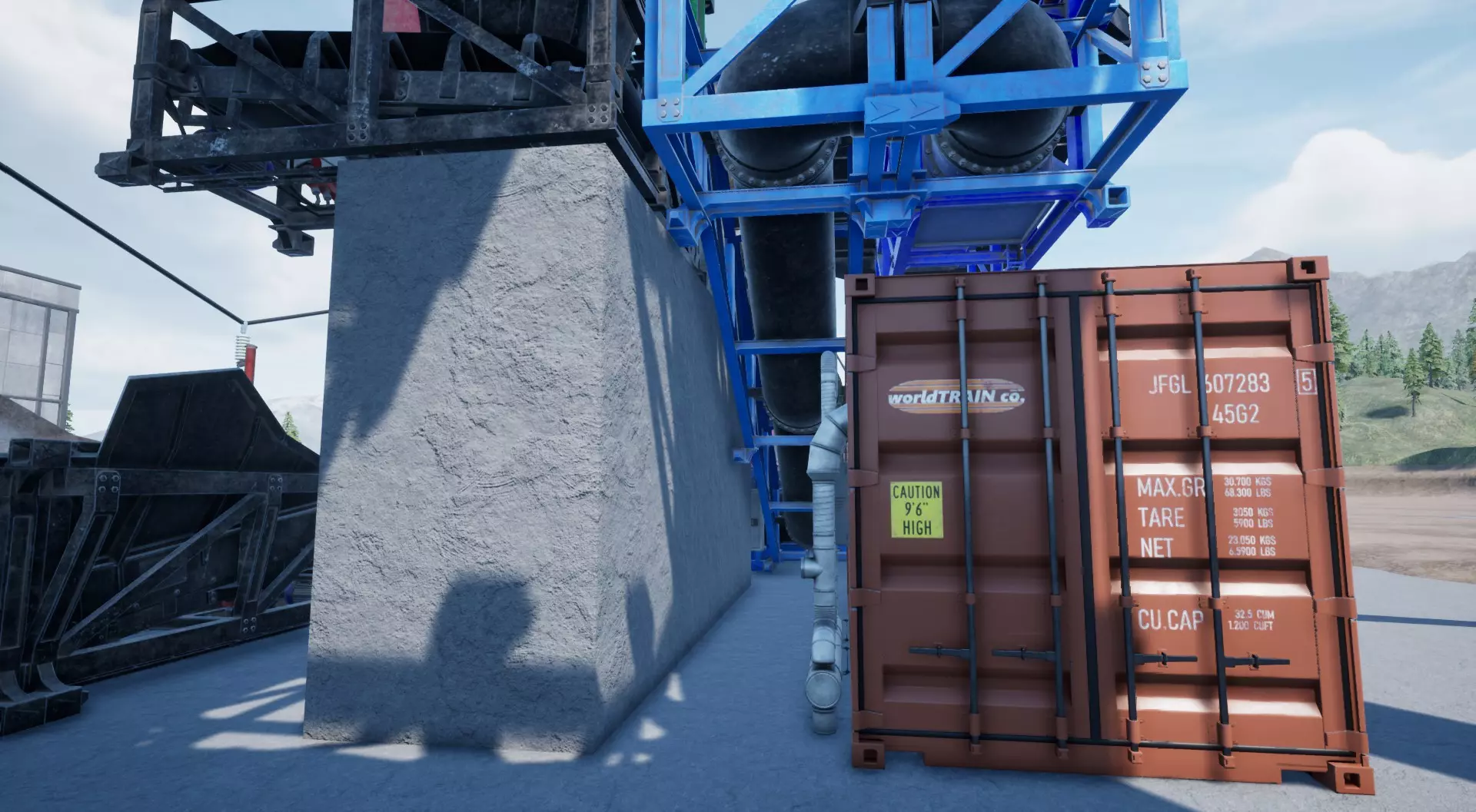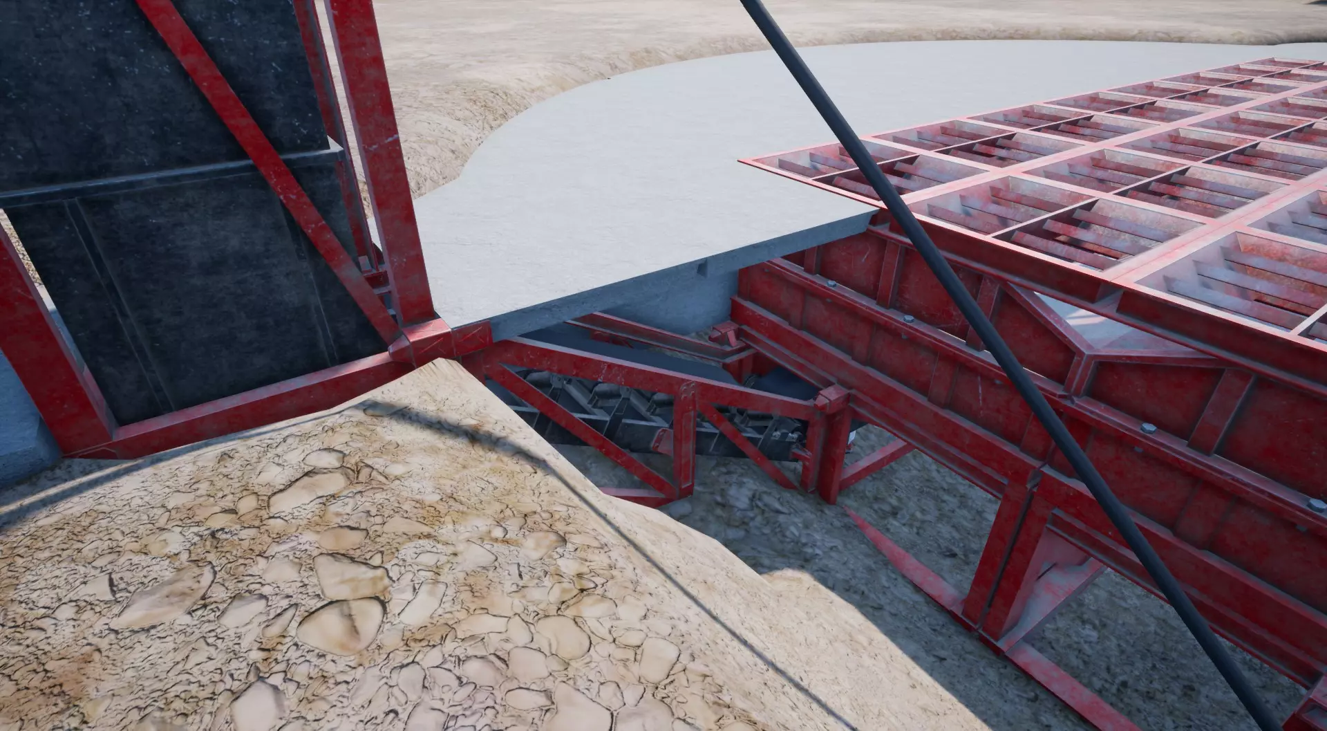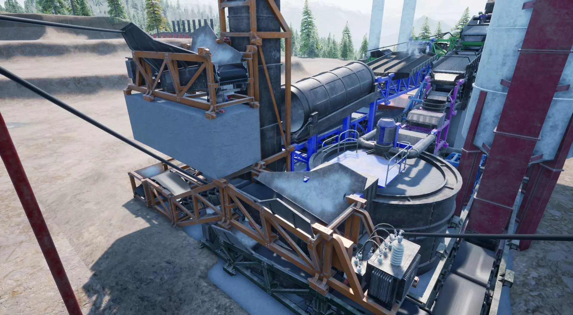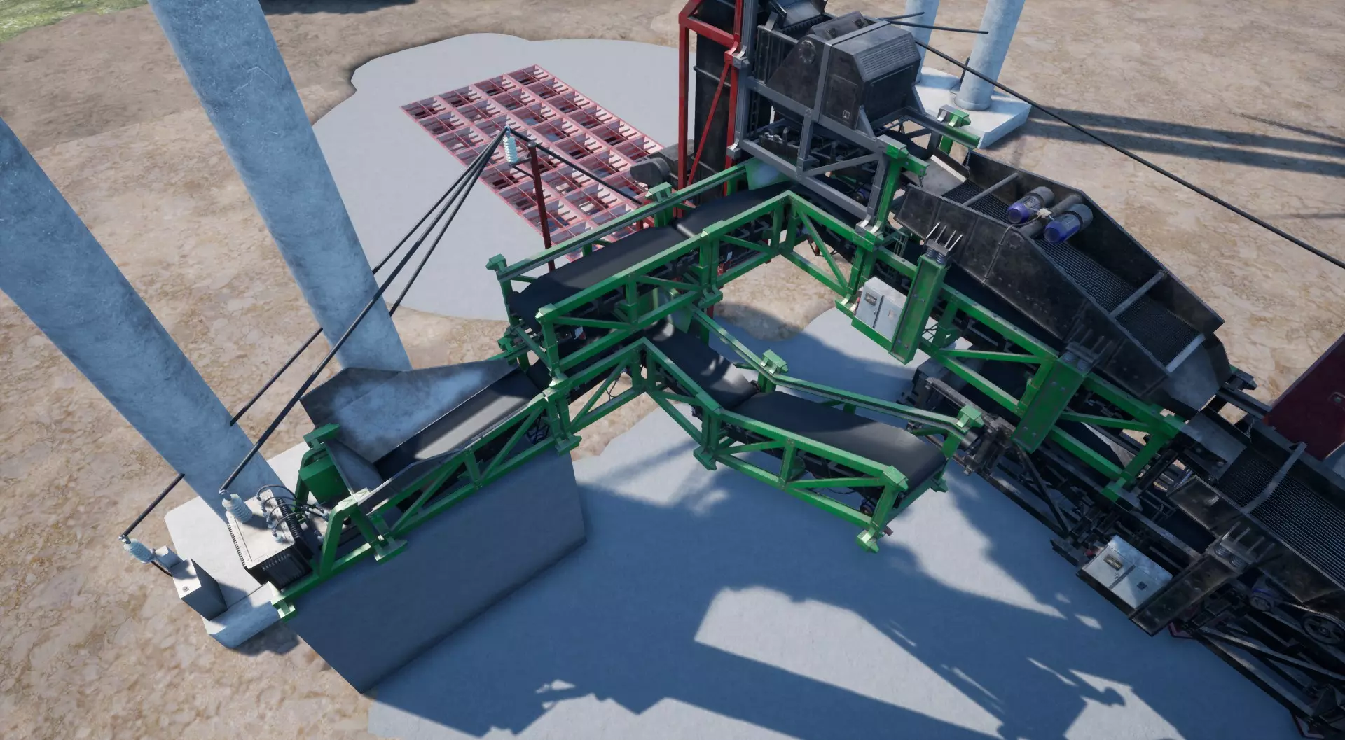 合并矿石 目前,我们有两条“矿石线路”。一条来自漂浮采集器,另一条来自滚筒筛。 要在不直接放置在传送带上,甚至不使用合并传送带的情况下合并它们,我们必须使用一些“变通方法”(仍在“规则”范围内)。 不用担心——这些混凝土块并非悬在空中,它们由正后方的柱子支撑——你可以从另一个截图角度看到这一点: (我们使用第二个电网作为电力输入)