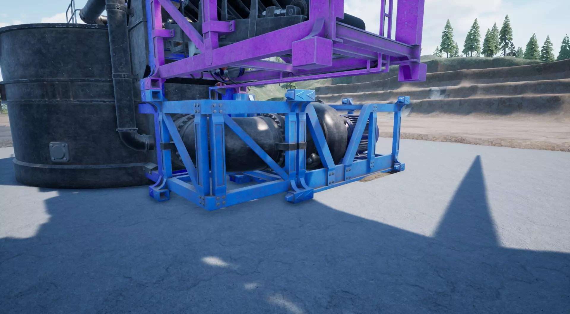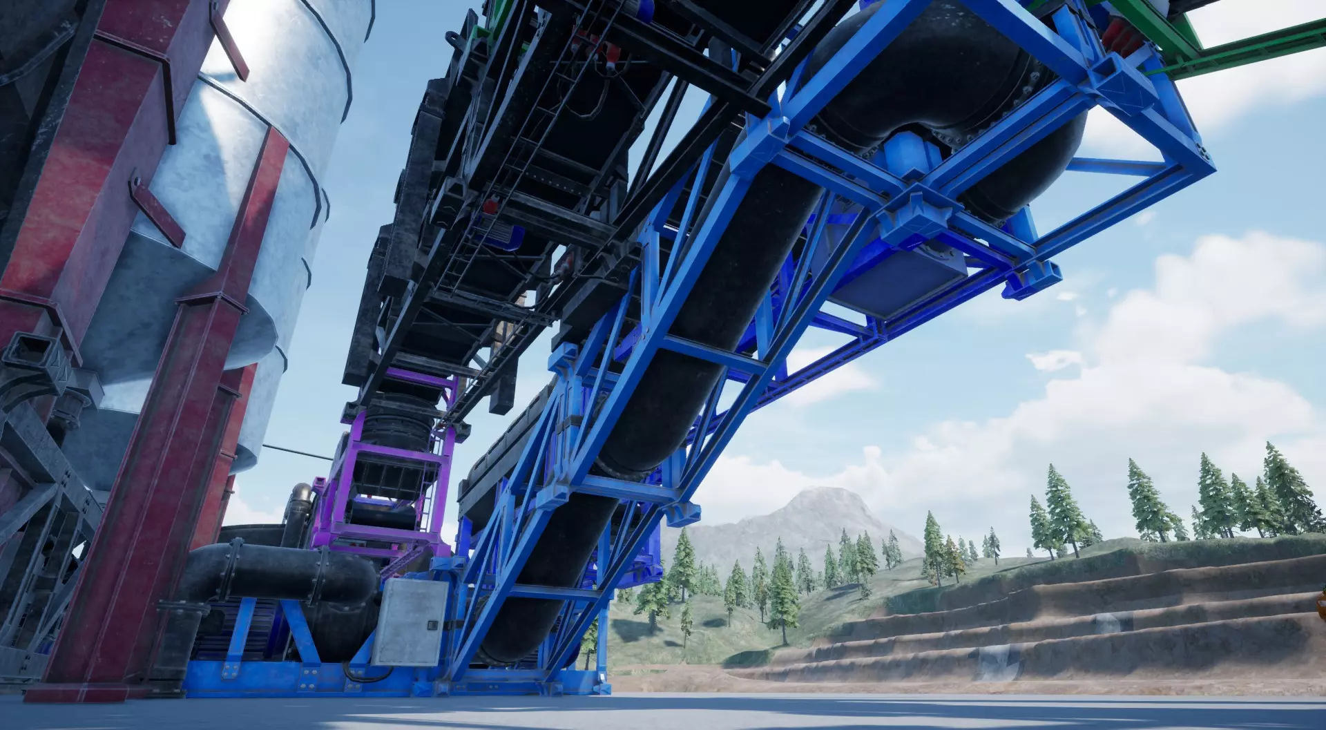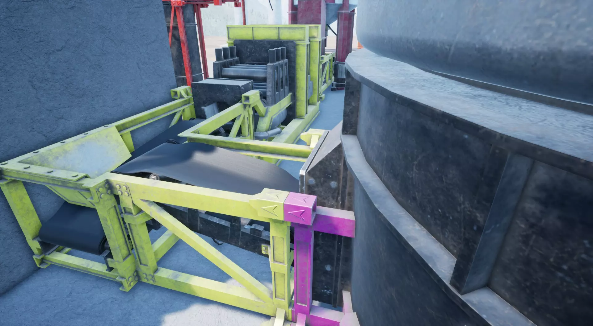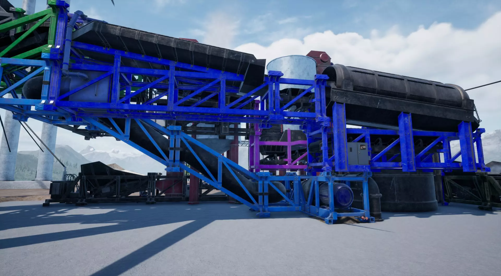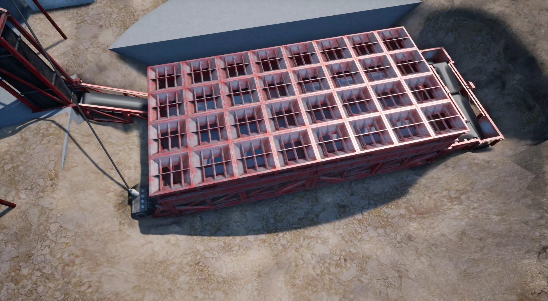 棒材滚轴与存储装置 我们就快完成了! 只需放置一些传送带、棒材滚轴以及最后一个存储装置。 不要忘记在棒材滚轴后安装一个2米长的传送带,否则会与上方的筛选机发生严重的模型穿模问题! 现在它应该看起来是这样的: