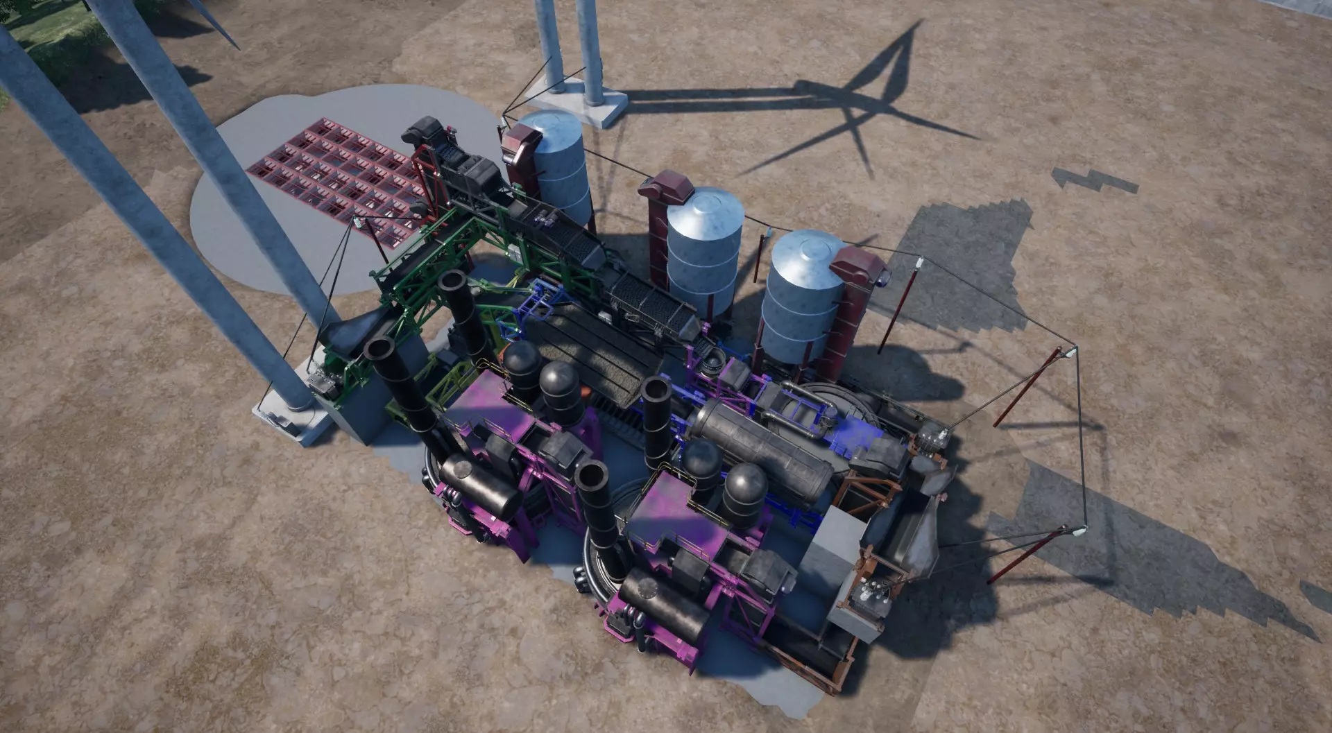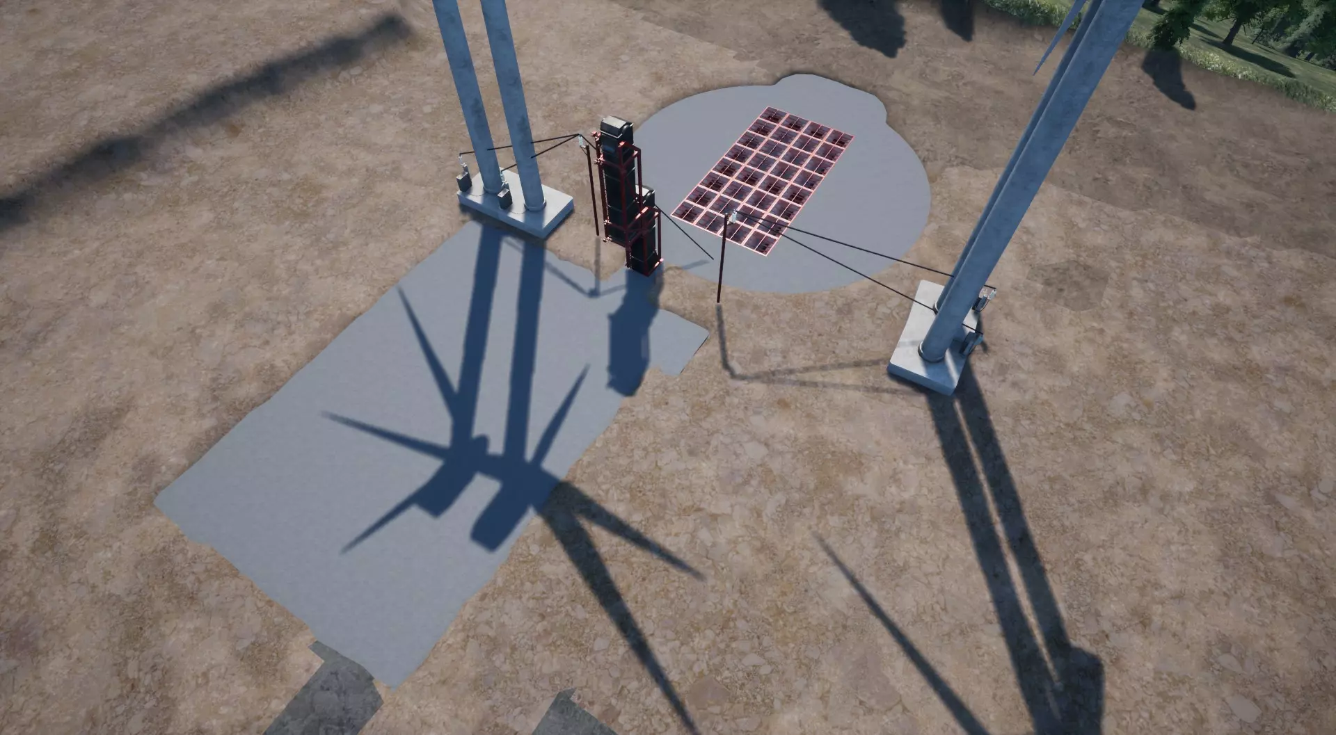 重要提示: 将电力输入连接到电梯另一侧的 pylons(电力塔)上(如果你将所有电力都接入同一个电网,会导致过载爆炸。你必须像截图中展示的那样,设置两个独立的电网!) 如果你用混凝土块封闭地面,需在电梯前使用混凝土地砖,以避免严重的模型穿模问题。