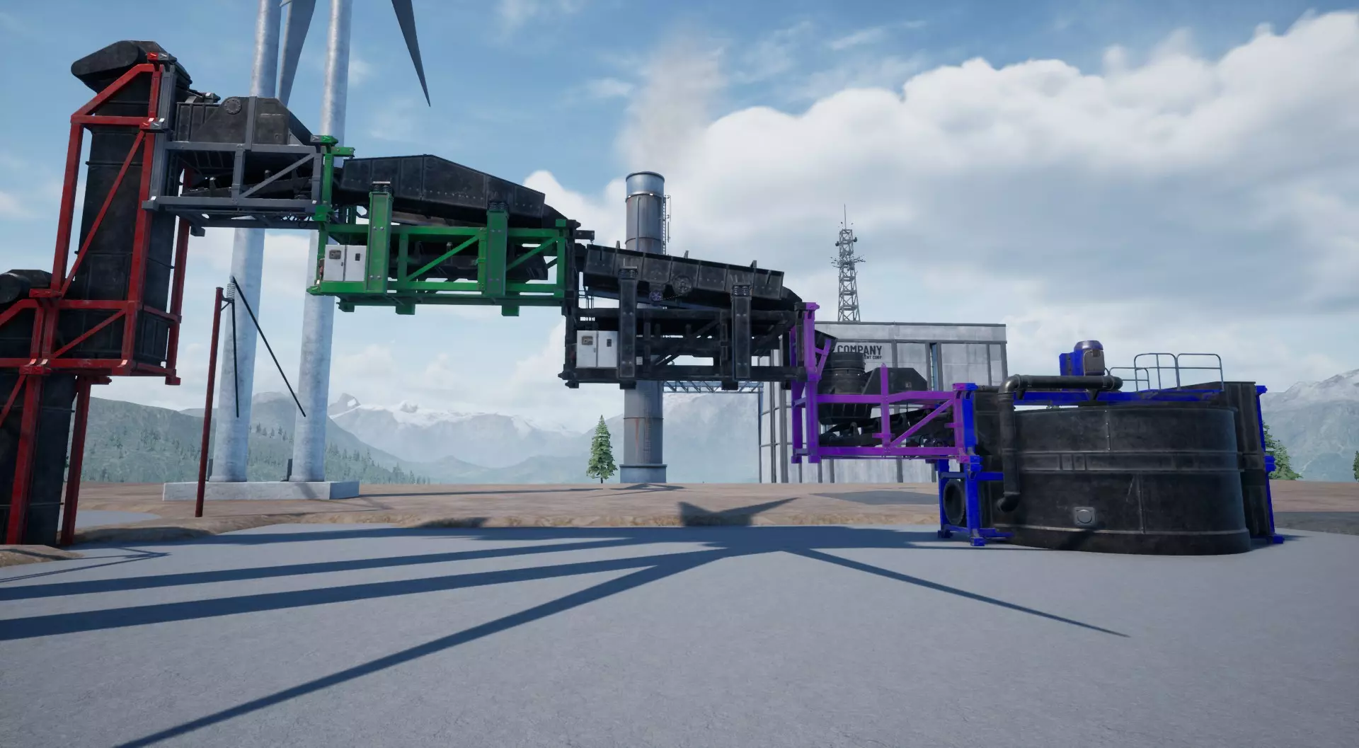 这就是我们开始所需的全部准备。 主线(石路) 让我们先建造主线(石路): 从顶部升降机向下到地面,按顺序放置颚式破碎机、振动筛、煤炭筛、圆锥破碎机和泡沫浮选机。 现在它应该看起来像这样: