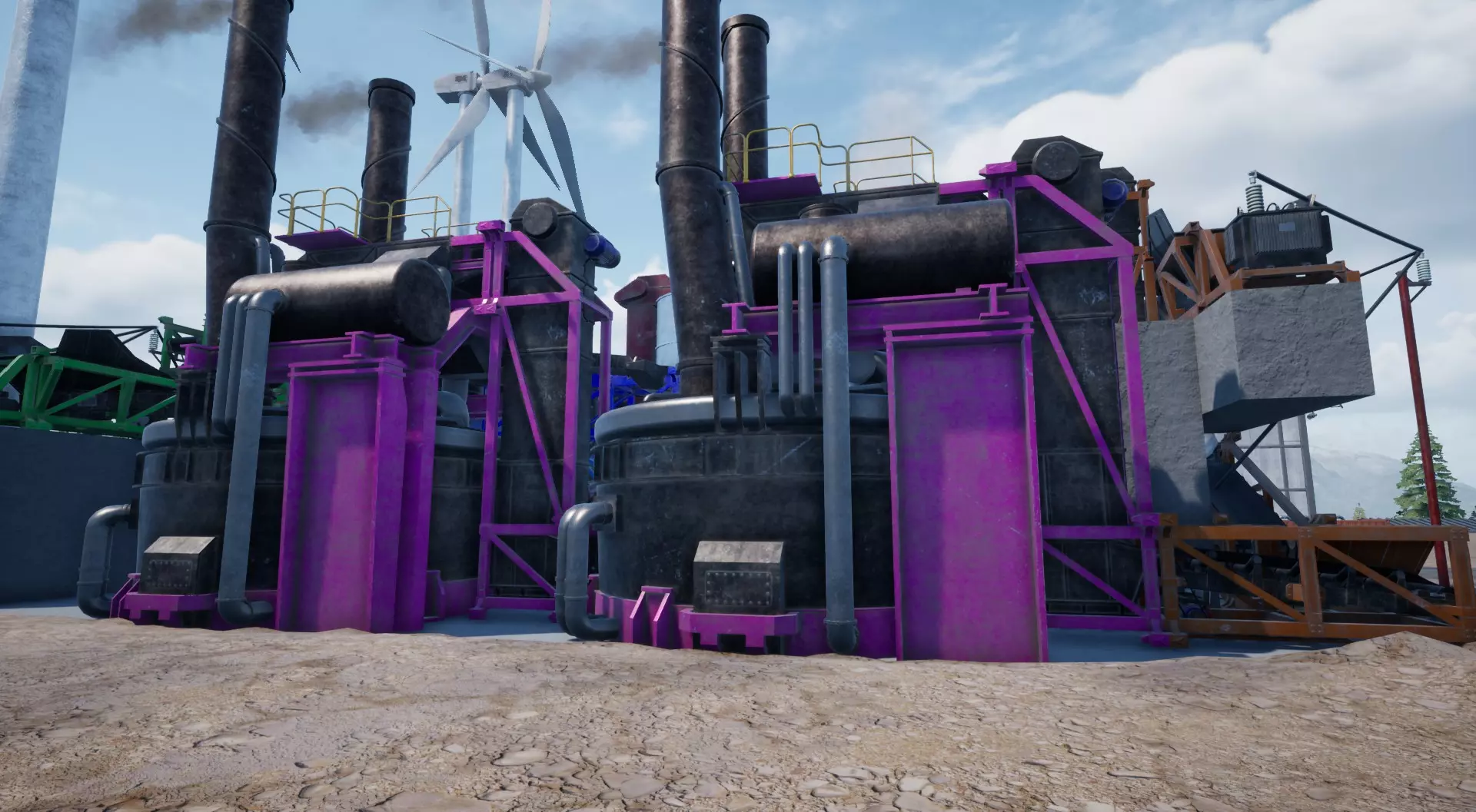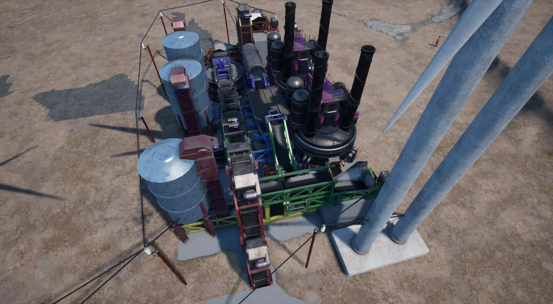 放置2部电梯和4个风力发电机(每个电网各2个发电机)后,应该就是这样的效果。