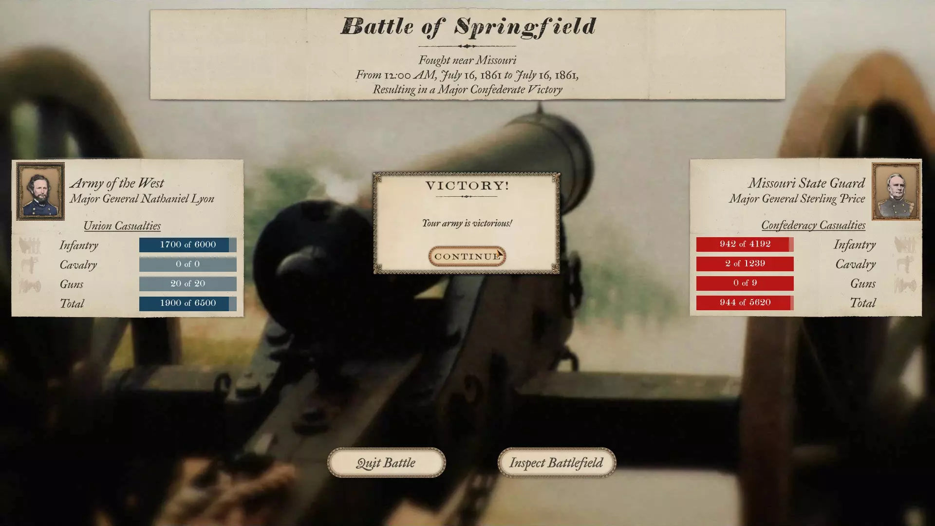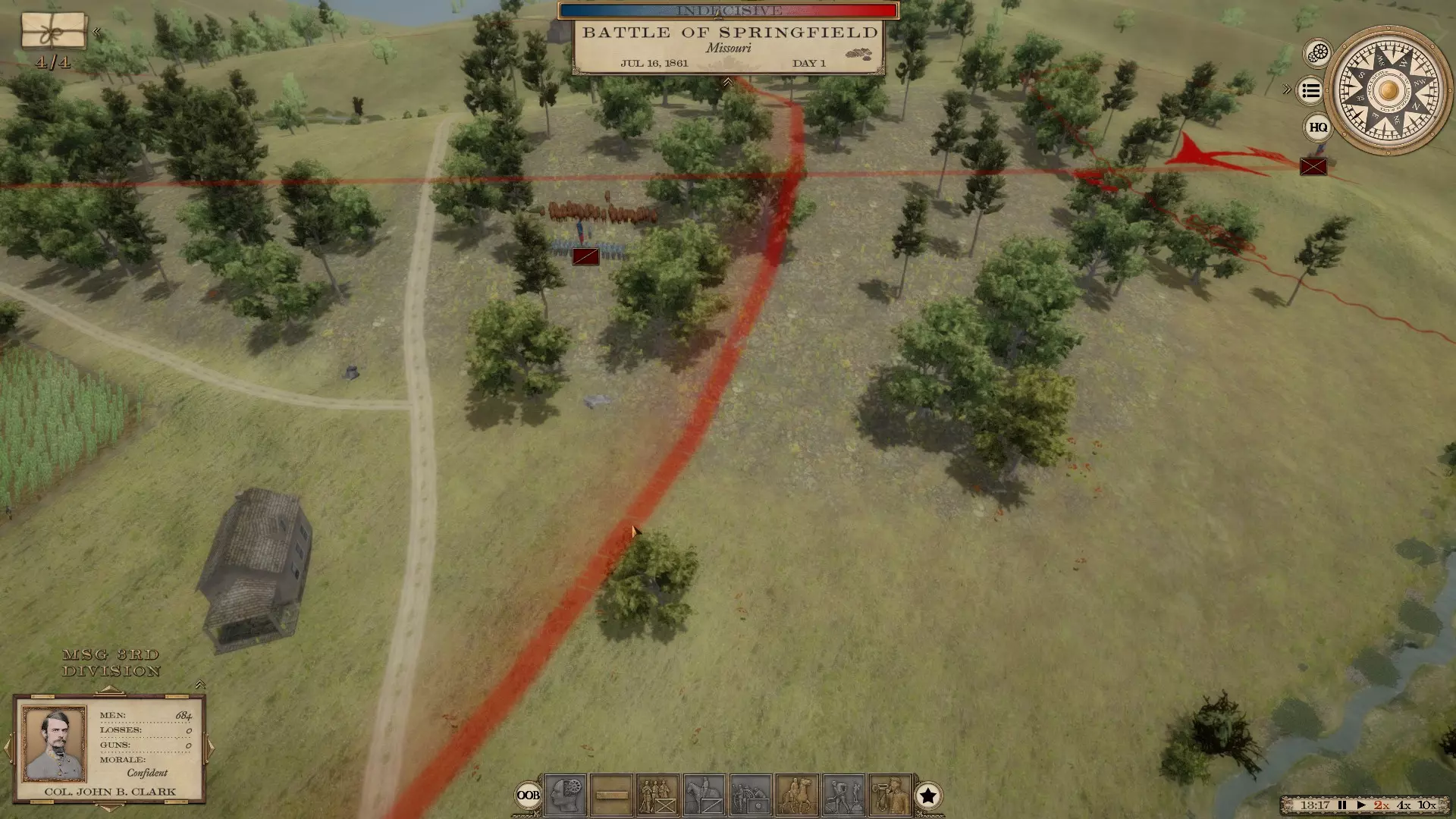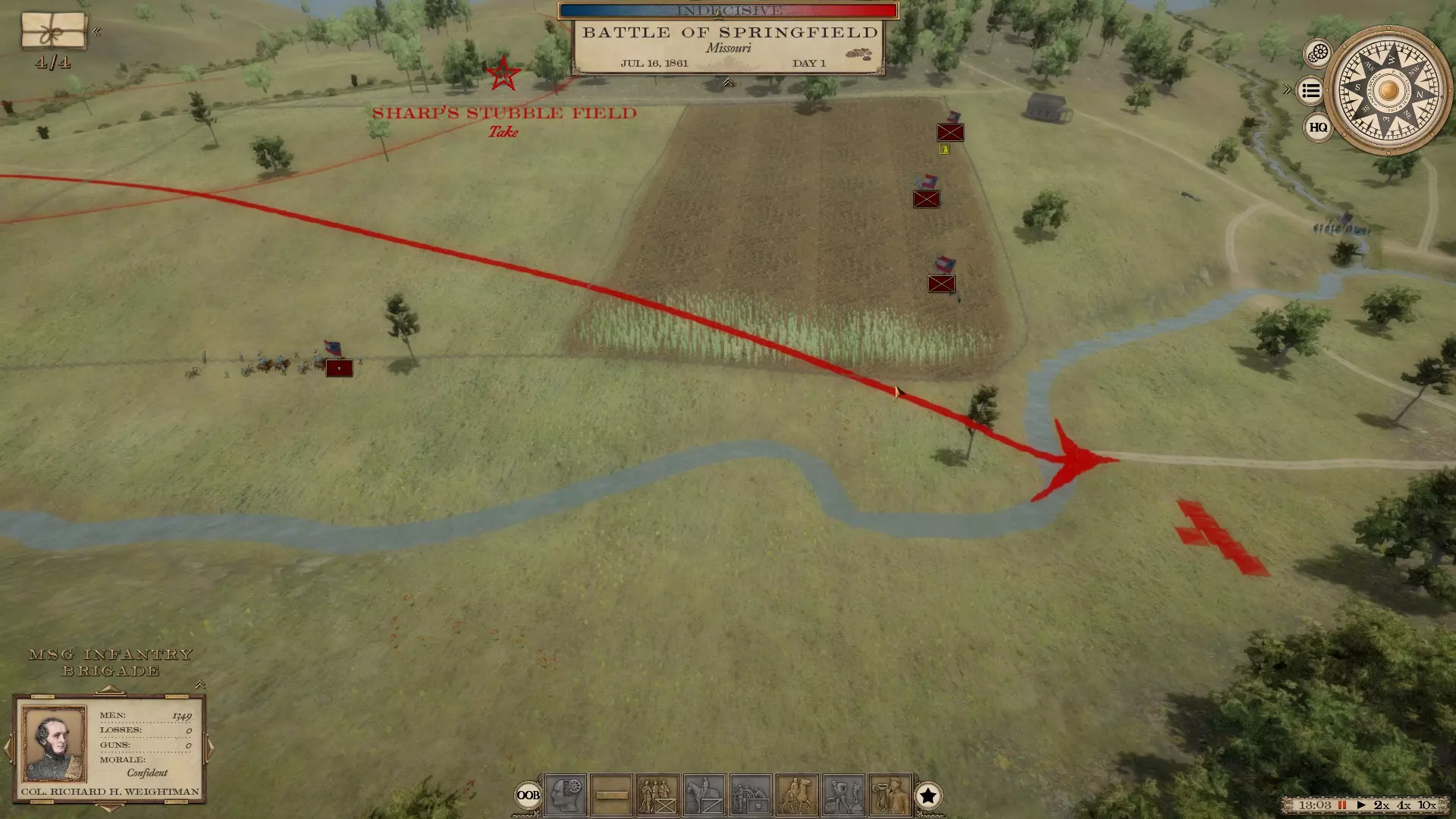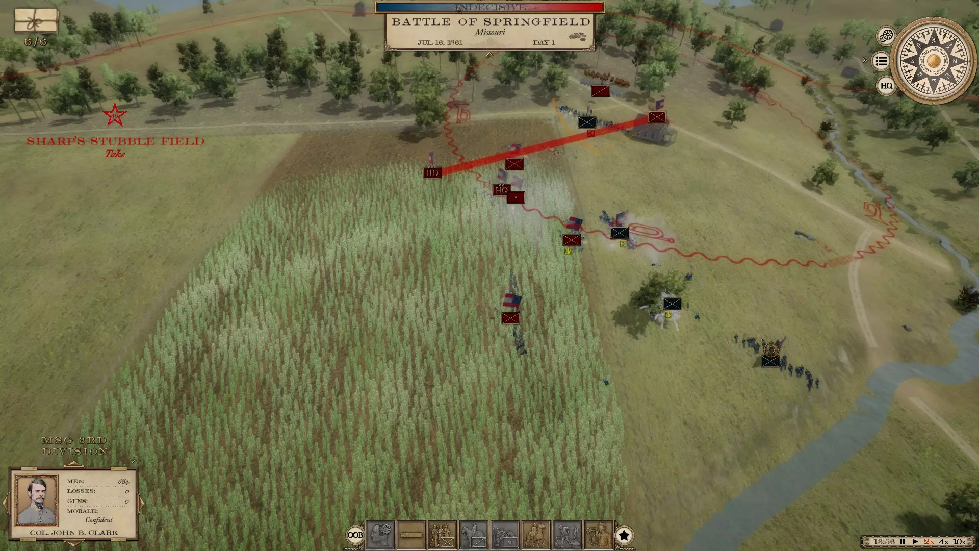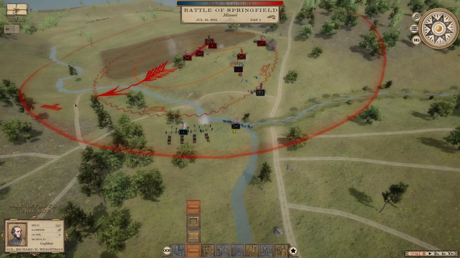 这将是一份随着我对游戏的深入体验而不断更新的指南 初始战役 1861年的战役存在一些问题。建议从1862年开始游戏。同时,建议每5天保存一次进度,这样即使游戏崩溃,也不会丢失太多进度。 战役作战 当你开始战役时(我从1862年开始),你会发现在密西西比州、田纳西州、弗吉尼亚州各地以及佛罗里达州等地已经有许多组建完成的军队。 我建议你进行部队整合。要移动一支军队,你需要点击军队图标,然后右键点击你希望军队前往的区域。此时,你可以通过左键点击不想要的运输方式来选择运输模式(运输方式包括海路、陆路和铁路,通常这三个选项都是高亮显示的——例如,如果你想走陆路,就点击铁路和海路选项,它们就会变成灰色)。然后点击底部的对勾,在命令延迟后,你的军队将沿道路移动到你指定的位置。 命令延迟是本游戏中需要适应的重要机制。在真实的战争中,没有无线电可以立即传达指令。你必须派遣骑兵去传达命令,而接到命令的人又得派骑兵向其下属传达进一步的指令,因此调动一个师或更多兵力是一项耗时的任务。所以你要尽量提前规划,让你的军/集团军在合适的时机行动并保持紧密协同。此外,你需要让你的军保持在主力部队的指挥部范围内,这样一来,当一场大战爆发时,比如像葛底斯堡战役那样,整个军队就能集中起来。 战术战斗 战术战斗是游戏的核心内容,所有的机动、招募以及其他相关操作都是为了让你进入战术战斗。在这款游戏中摸索了一段时间后,我认为自己已经稍微弄明白如何指挥一场战斗了(至少是陆战,还没尝试过围城战)。 你将从部署阶段开始,届时你的军队(无论规模大小)将会出现在战场上或正在赶来的路上。现在你可以让整个军队到场,也可以只让部分军队到场(查看指挥报告可以看到完整的战斗序列,以及是否有援军正在赶来——例如葛底斯堡战役,美军一开始有第一军和第十一军,之后会有更多部队抵达)。 假设你有一个包含三个师的军。 你可以从部署界面查看战术地图,此时会显示远景第三人称视角。根据现有的目标以及那些被敌方颜色标记的目标,你可以制定策略。你可以点击你的陆军指挥官,将整个军队移动到某个地点。你也可以找到每个师长,将他们分别部署在不同的位置,这样每个师长的师就会移动到相应区域。你拥有部署范围。一旦将部队部署到理想位置,点击开始即可进入战斗。 在战术步兵战斗中,你需要注意三个要素:武器类型、掩护以及命令距离。2000人的步枪旅比2000人的滑膛枪旅射程更远。步兵有三种射击命令设置:远程、中程和近程,你选择的设置将决定士兵开火的距离。例如,若为滑膛枪旅选择远程,射程可能约为100码;而如果士兵装备洛伦兹步枪或恩菲尔德步枪,射程可能会达到其三倍。因此,在开始战斗时要注意这一点。 要充分利用树木和道路等地形进行掩护。部署旅级单位时,你可以右键按住该单位来调整其朝向。单位的部署会依据可用正面宽度进行,因此若尝试将2000名士兵部署在50码宽的栅栏缺口处是无法实现的,但如果将他们部署在开阔的山坡上,就能形成整齐的直线队列。对此也需留意。树木、栅栏、墙壁均为良好的掩护物。高地则十分有利。桥梁和浅滩等狭窄通道可造成敌方大量伤亡。 与下达命令的将军之间的距离同样重要。你可以开启自主行动模式并分遣一支部队,使其自行作战。但如果不开启该模式,而是采用常规的信使系统,那么就必须意识到命令会存在延迟。例如,当你占据高地并对敌人展开猛烈攻击时。你看到敌人纷纷倒下,心想很快就能让一个旅发起刺刀冲锋。但这会有延迟,因为旅长必须派人通知各团指挥官冲锋即将开始。所以你需要在预计敌人开始动摇前稍早下达命令,这样冲锋才能适时发起。 在火力下机动或突袭时,距离也很重要。你的将军离部队越近,士兵的反应就越快。 深度战术战斗 下面我将结合我最近打的一场战斗——1861年威尔逊溪战役(南方邦联视角),来谈谈深度战术战斗。 我当时指挥着斯特林·普莱斯及其麾下5600人的部队。我有三个各约650人的旅、一个1300人的旅、一个1200人的骑兵旅、一个120人的炮兵连以及一个约700人的旅。 我们正从威尔逊溪方向赶来。首要任务是派人夺取目标点。通常,当你或对手占领某个目标点时,它的颜色就会发生变化。这是判断敌人来袭方向的一个不错的初始方法。 于是我开始行动,率领部队向北进发,前往地图上一片设有围栏的农田。我派遣三个650人的旅以及那个1200人的骑兵旅(已下马)前往这片围栏区域。我还派700人的旅前往左翼夺取一个目标点并进行警戒。我的炮兵连和1300人的旅则作为预备队。一切准备就绪,我们出发了。