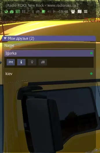 之后,你的朋友需要停车并拉手刹(必须在城市范围内,不一定和你在同一个城市)。在界面中选择【三人图标】选项,然后选择你的昵称。如果你已完成自己的操作部分,你朋友界面中带有标记和卡车的选项就会激活。朋友点击卡车图标后,就会移动到你身边接收你的货物。