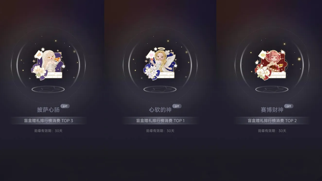 本次发布3月盲盒榜单,向好友赠送盲盒累计心意值可入围榜单,冲进前3名能获得限定“真神”专属勋章与定制道具。3月封神荣耀榜TOP3分别是心软的神、赛博财神、披萨心肠,同时展示了赠送排行榜详情与对应定制道具。