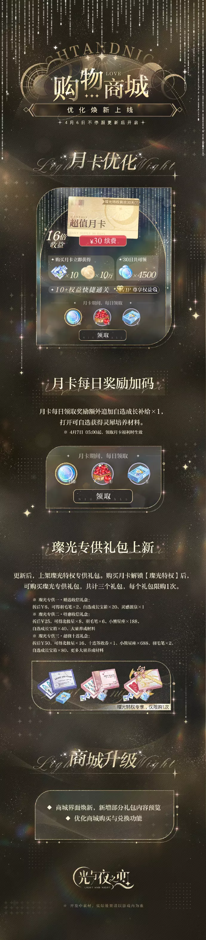 《光与夜之恋》购物商城于4月6日不停服更新后优化焕新上线,本次优化包含月卡优化与商城升级:月卡每日奖励加码,还上新璨光专供礼包;商城界面焕新,购买与兑换功能也得到优化。