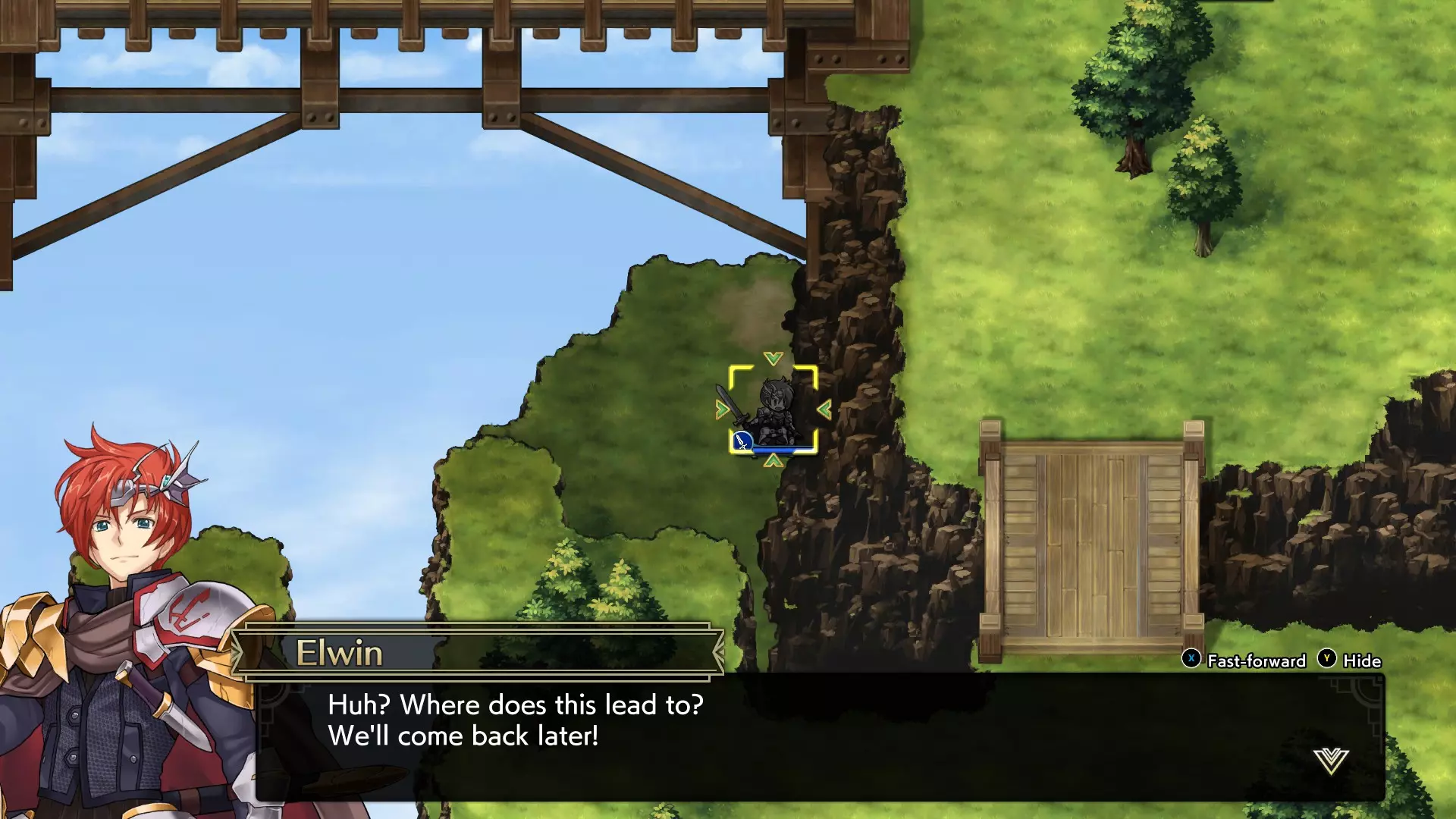 在第六章剧情结束时,你会被询问是否要调查发现的东西。确保选择【是】。 感谢ProDaKah在YouTube上的攻略。我最初调查时,所有资料都显示艾尔文必须完成两项任务,但这可能在重制版中有所改动。 第八章额外内容:出发!问答时间/熟悉的面孔 在第八章,你需要让艾尔文移动到桥对岸下方悬崖壁的中间格子处。