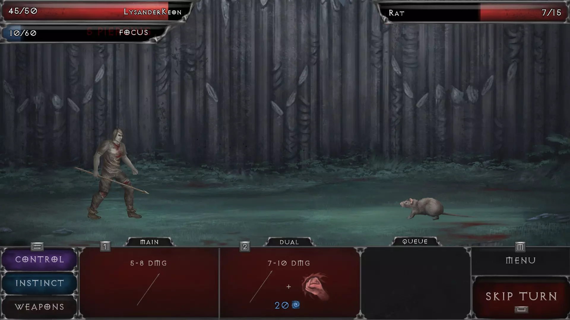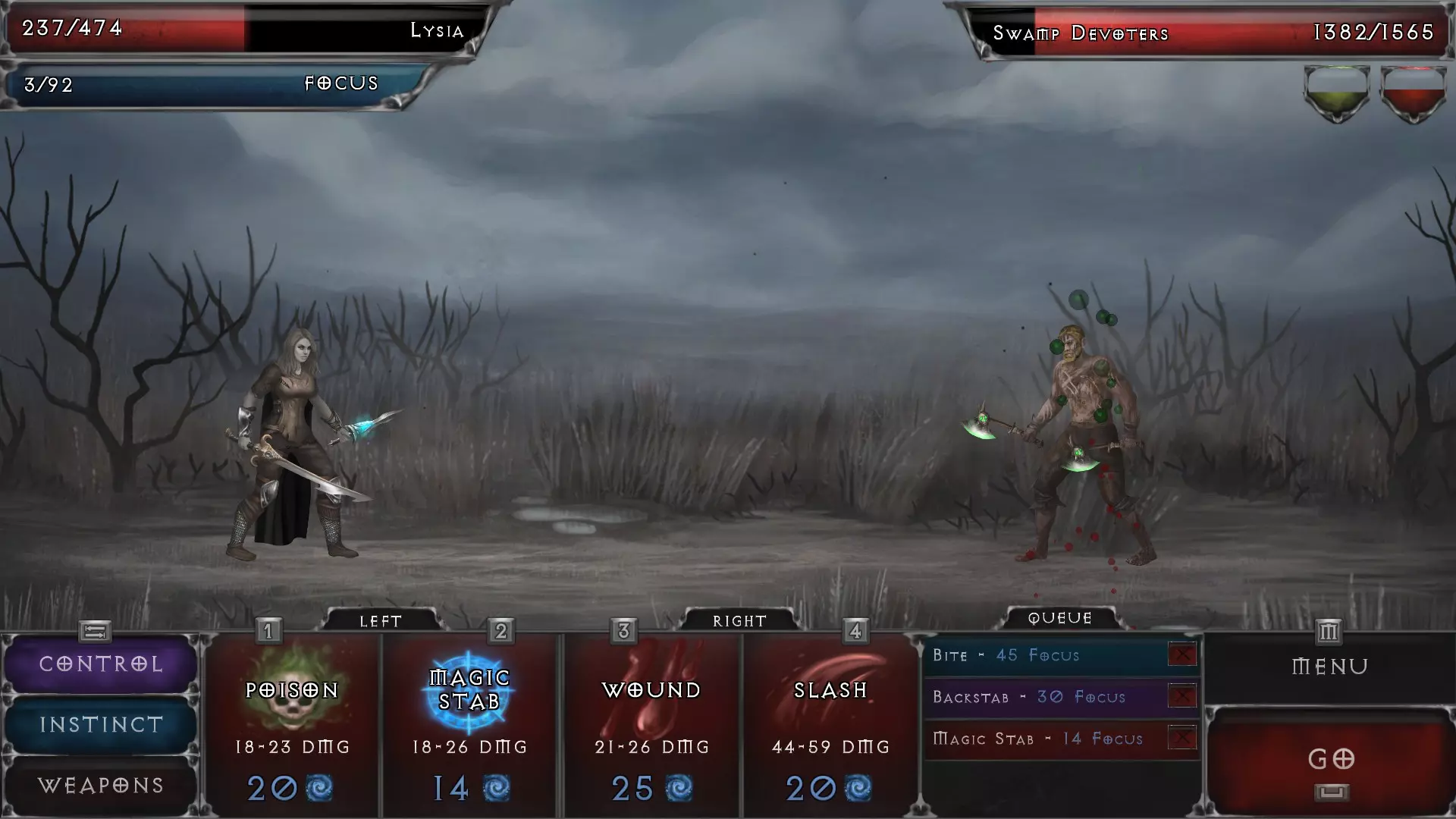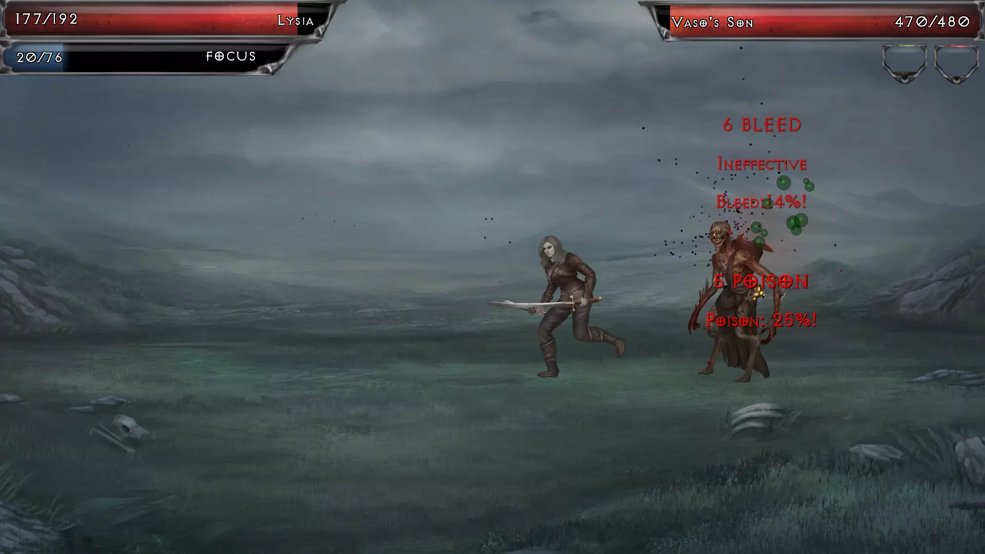 任何玩过《魔兽世界》中术士职业的玩家都知道什么是dot,所以我会经常使用这个术语。dot——可以是增益效果或减益效果——是一种持续一段时间的主动技能,会对玩家角色或战斗中的敌人产生影响。 玩家角色可以对敌人施加多种dot,反之亦然。 中毒——某些武器(如匕首)在击中敌人后会附加dot形式的额外伤害。每次敌人受到dot影响,其持续时间和伤害都会增加。中毒伤害在敌人回合结束时生效,其中毒dot会逐渐减少以显示武器效果持续时间的消耗。愤怒技能可以大幅提升中毒伤害。当敌人身上有中毒持续伤害效果时,其血条下方会显示一个绿色方框。 * 我在副手上使用带毒武器,这样当我使用专注攻击时,会造成主武器的主要伤害,同时有几率附加一些中毒伤害。 * 中毒效果在群体战斗中不会转移,所以如果敌人A死于中毒但效果仍有持续时间,敌人B不会因此获得同样的持续伤害效果,尽管视觉上可能看起来并非如此。 * 虽然我还没遇到过对中毒伤害免疫的敌人,但我确实注意到敌人躲避中毒攻击的频率相当高(例如后期的老鼠和一些不死生物)。 流血 - 另一种非常强大的能力,其伤害可以通过愤怒技能提升。流血会造成武器的基础伤害,并以百分比形式在对手身上施加流血持续伤害效果。当这个百分比达到100%时,敌人会因流血过多而死亡——这能杀死大多数前期/较弱的怪物,并对较强的怪物造成显著伤害。在战斗界面中,你可以在敌人的血条下方找到红色的流血状态框。 我在主手武器上使用流血效果,因为它会造成武器伤害并附加持续伤害。这种效果可以叠加,所以你可以使用两把带有流血效果的武器,或者一手使用流血武器,另一手使用中毒武器。 敌人可以同时处于中毒和流血状态。 我尚未注意到流血效果有持续时间。 当较强的怪物身上的流血百分比达到100%时,它们不会立即死亡,但会受到显著伤害,且流血持续伤害效果会消失,需要重新施加。*流血效果与背刺技能搭配效果最佳,因为背刺技能能让你获得最多五次攻击机会——每次攻击都有几率造成10-15%的流血伤害,除非你用技能点进行了升级。 *和中毒效果一样,我还没遇到过对流血免疫的敌人,但确实注意到有些怪物能完全闪避带有流血效果的攻击。这可能只是运气问题。 战斗中还可以给敌人施加其他技能和持续伤害效果,但我不像使用流血或中毒那样频繁使用它们。 【蝙蝠群】:召唤一群蝙蝠,在5回合内造成持续伤害。每点技能点提升伤害。每级增加4-8点伤害。5级解锁。蝙蝠群会在敌人回合结束时造成伤害。 【骨折】:降低敌人的物理抗性。每点技能点提升1%。8级解锁。战斗部分3 - 敌人持续伤害效果 石化:使敌人闪避率降低55%,持续2回合。每点增加3%。25级解锁。虽然这听起来很酷,但我希望它能持续3回合或更久。以目前的专注值消耗来看,我觉得不值得使用,但到了游戏后期我可能会更多地使用它。